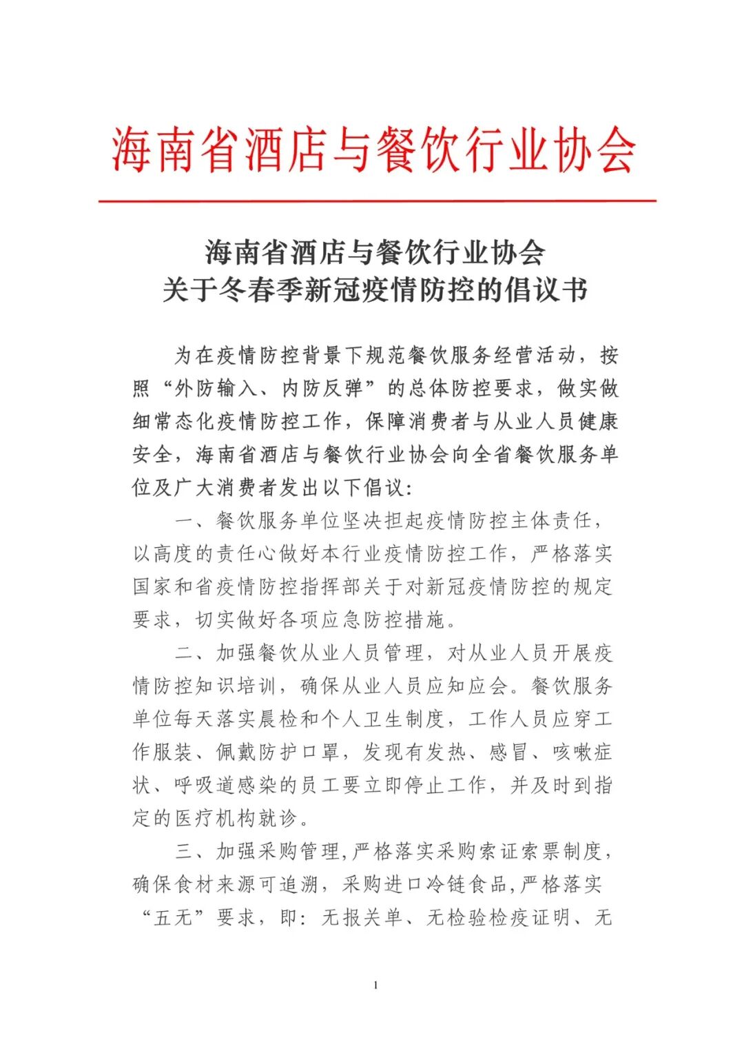 海南省酒店与餐饮行业协会关于冬春季新冠疫情防控的倡议书