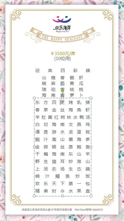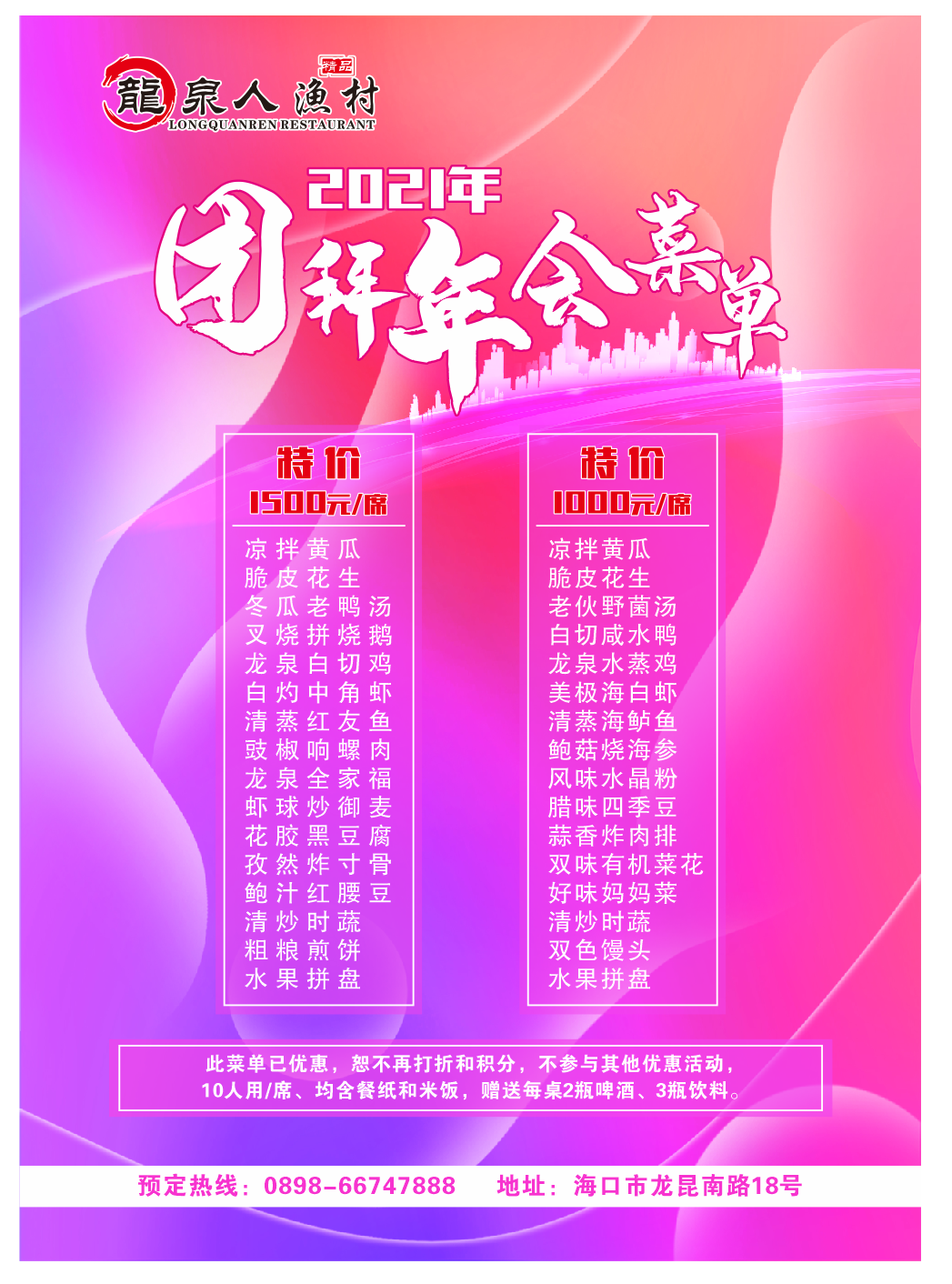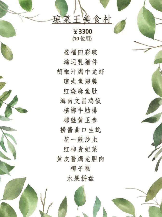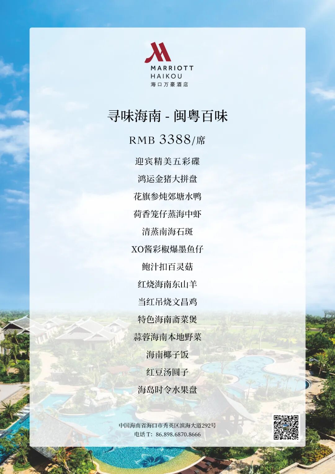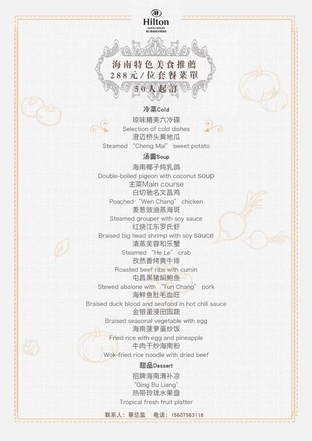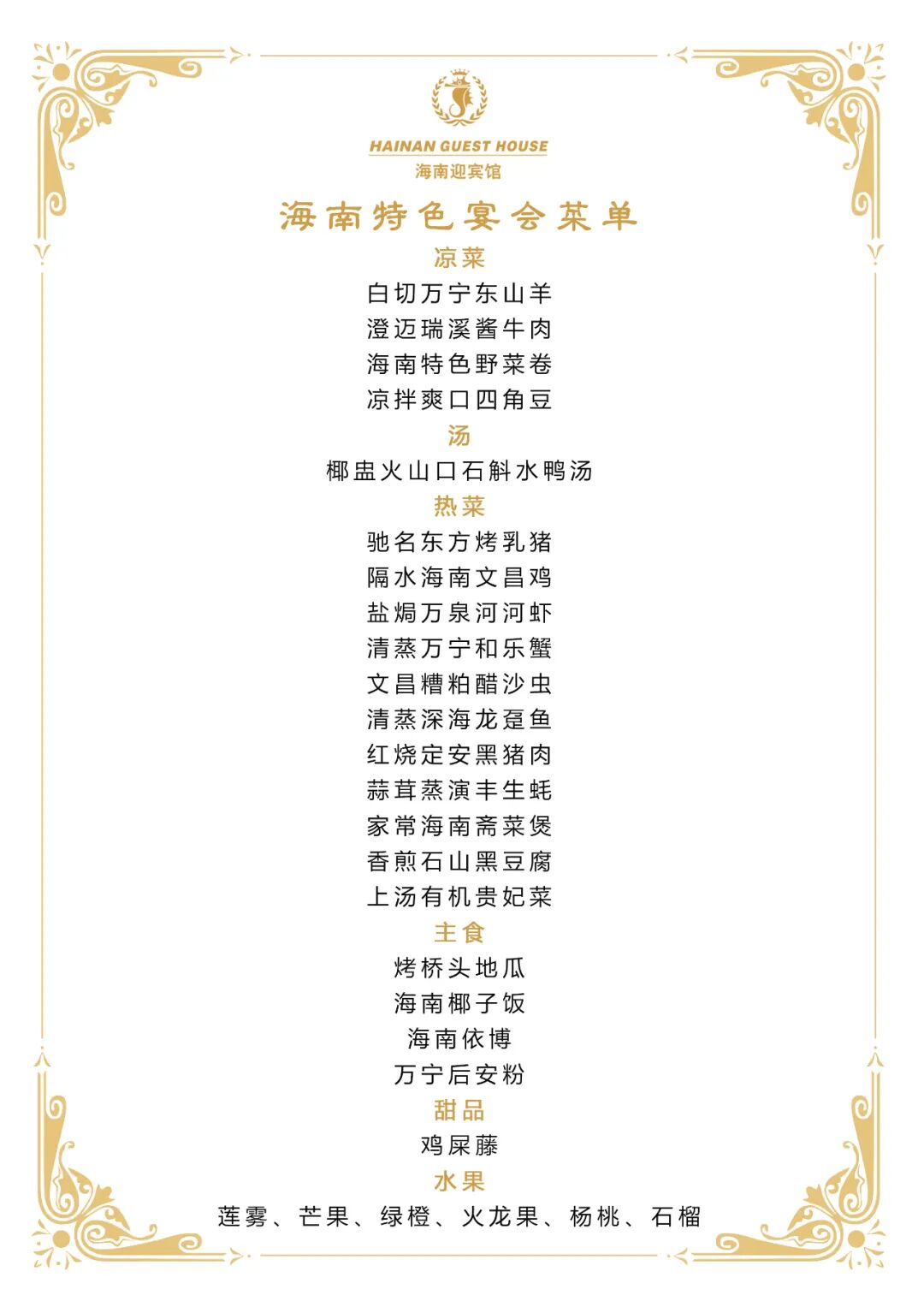 为以“海南特色菜单”+“会展”的创新形式推介琼菜文化,宣传推广海口市琼菜名店,提升海口市餐饮行业竞争软实力贡献力量,推动海口市餐饮、会展、旅游等产业的融合,助力海口国际美食之都建设,经各有条件承担会展接待的海口市酒店餐饮企业报送,市商务局和省酒餐协共同审定,由龙泉人渔村、华诚汇酒家、欢乐海岸美食联盟、琼菜王美食村、海南大院、海口鲁能希尔顿酒店、海口万豪酒店、海口星海湾豪生大酒店、海南君华海逸酒店、海南迎宾馆等单位推出的海南特色菜单共同组成《十大会展接待活动标准菜单》,在2020年11月26日开展的第二届中国(海口)琼菜美食节上正式发布,今起将向全省会展企业正式推介有关菜单如下(以下排名不分先后):
