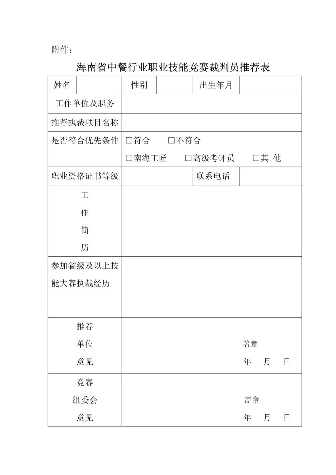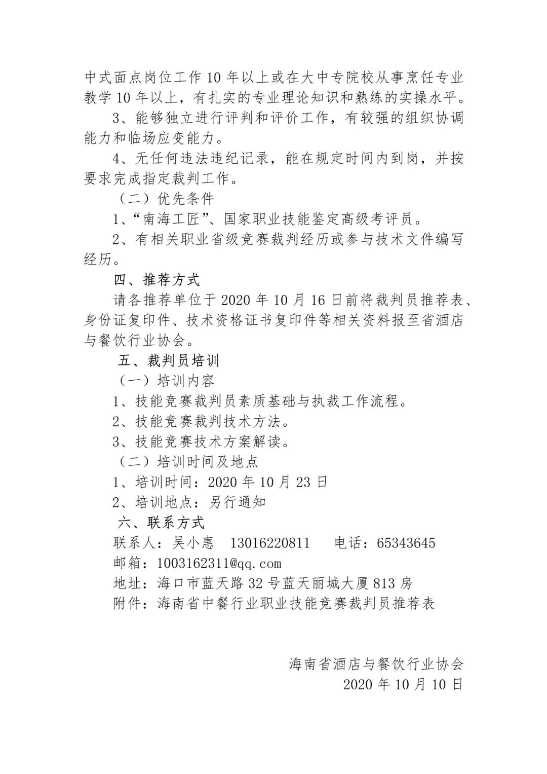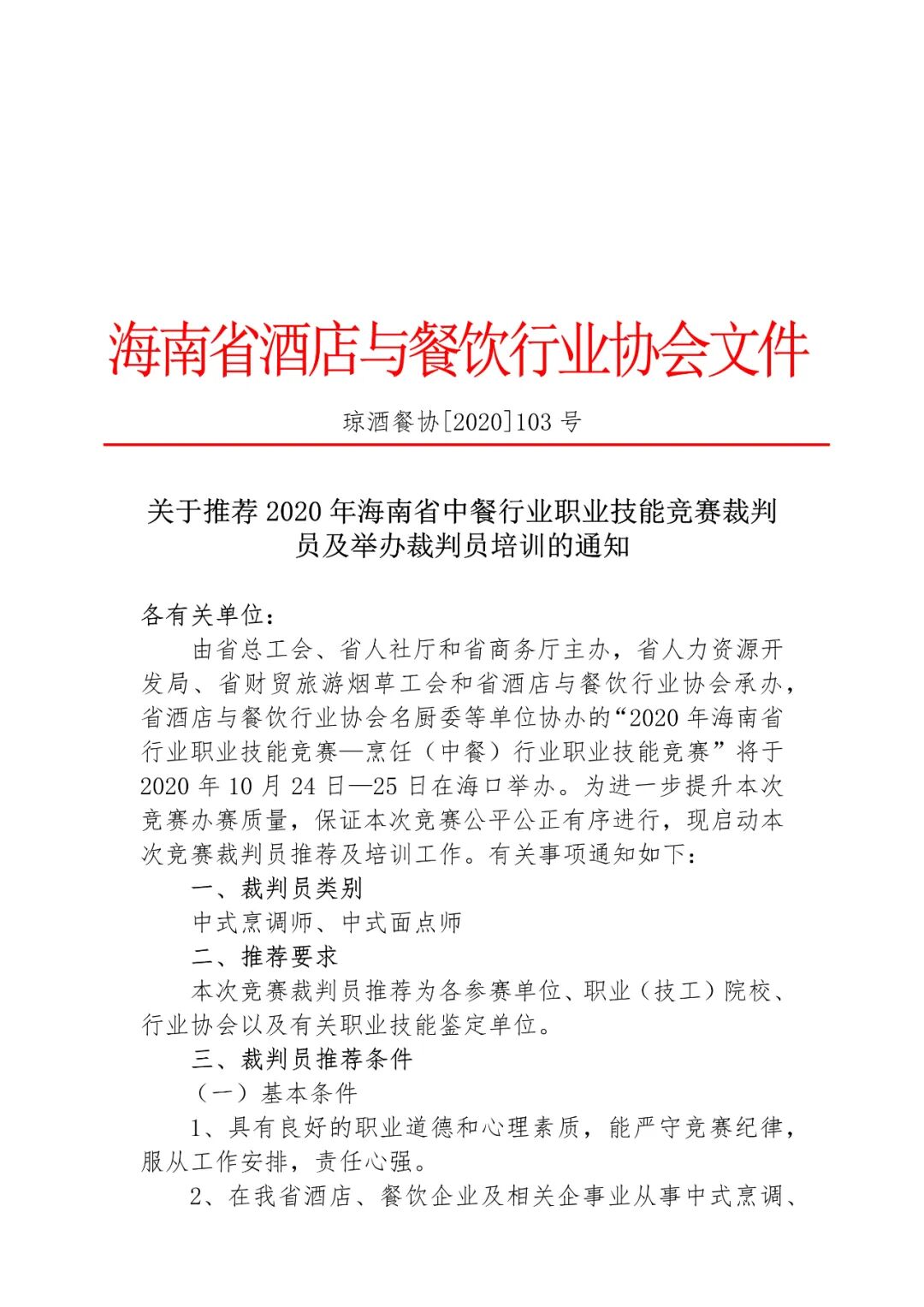 关于推荐2020年海南省中餐行业职业技能竞赛裁判员及举办裁判员培训的通知