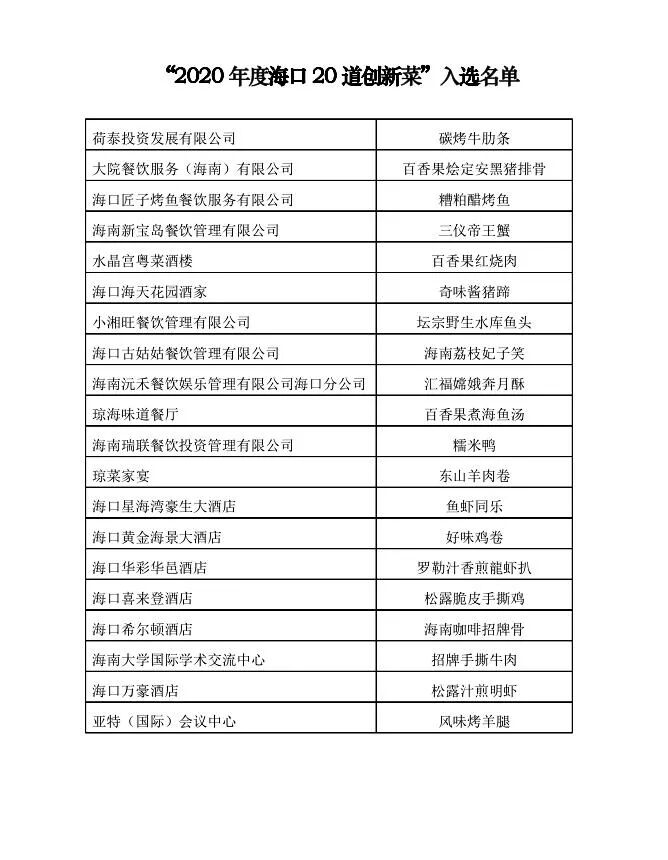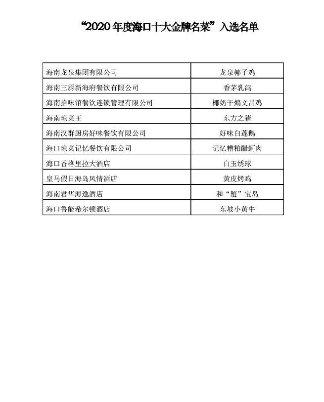 “2020年度海口十大金牌名菜、海口20道创新菜”评选活动入选名单公示