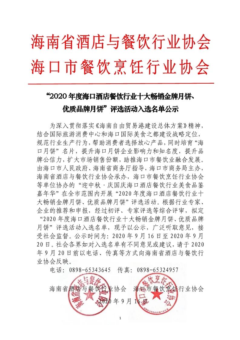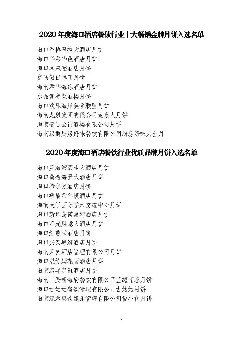 “2020年度海口酒店餐饮行业十大畅销金牌月饼、优质品牌月饼”评选活动入选名单公示