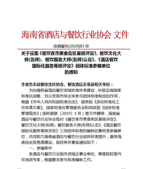 关于征集《餐饮夜市美食街区星级评定》等团体标准参编单位的通知
