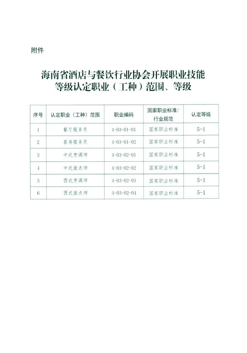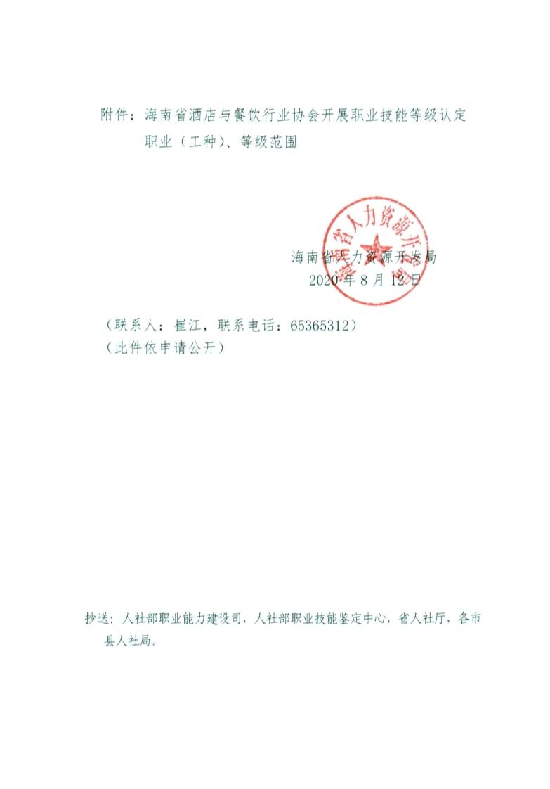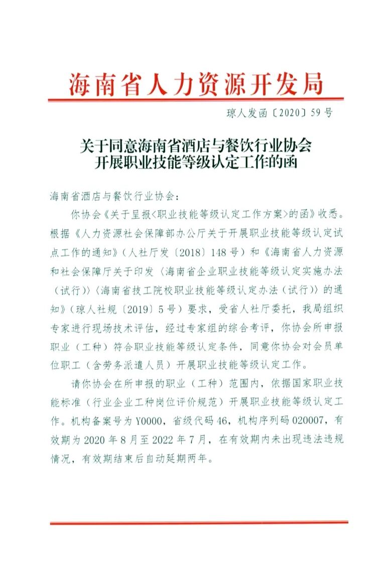 省人力资源开发局关于同意海南省酒店与餐饮行业协会开展职业技能等级认定工作的函海南省酒店与餐饮行业协会