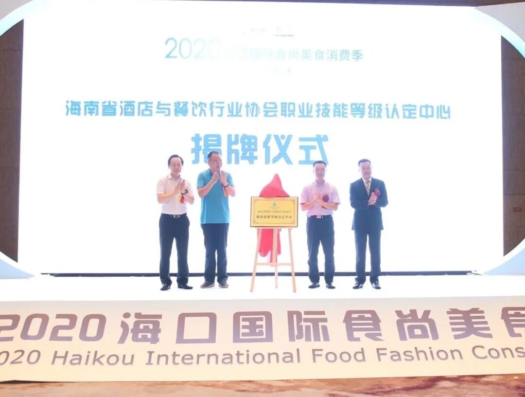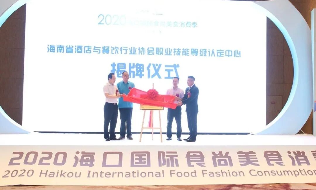 “海南省酒店与餐饮行业协会职业技能等级认定中心”揭牌仪式8月19日,在2020海口国际食尚美食消费季启动仪式上,省总工会党组成员、副主席何清,省人力资源开发局职业技能鉴定处处长欧善德,省酒店与餐饮行业协会执行会长陈恒和监事长李朝清共同为“海南省酒店与餐饮行业协会职业技能等级认定中心”揭牌。