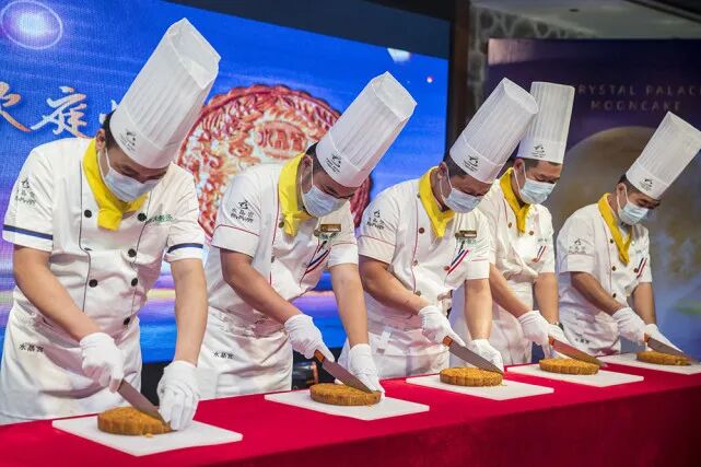 月饼品鉴,海南水晶宫首席制饼师傅陈观上带领的6位师傅为来宾们切割月饼 南海网 刘洋摄