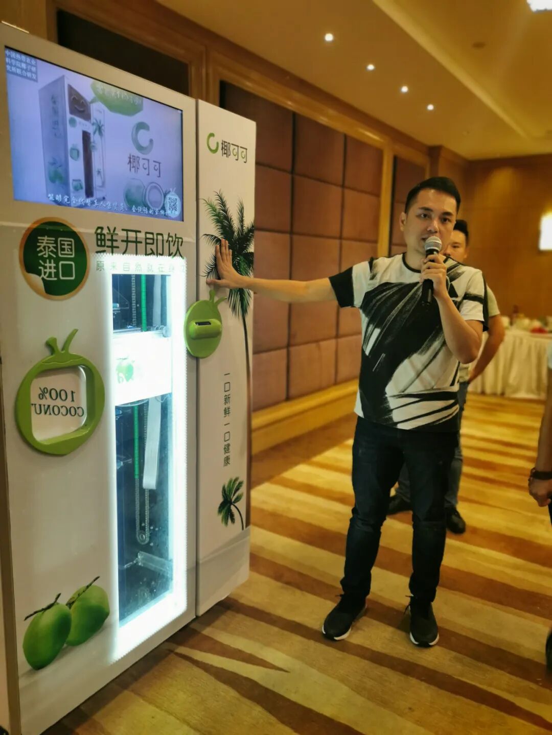 推荐特色的优质供应商资源是协会服务的一大重要职能,本次晚宴由椰多多科技公司赞助了美味的泰国椰子作为特色饮料,并现场演示了鲜椰自动开孔多功能一体售卖机,新颖的产品引起了在场嘉宾的重点关注和参与互动。