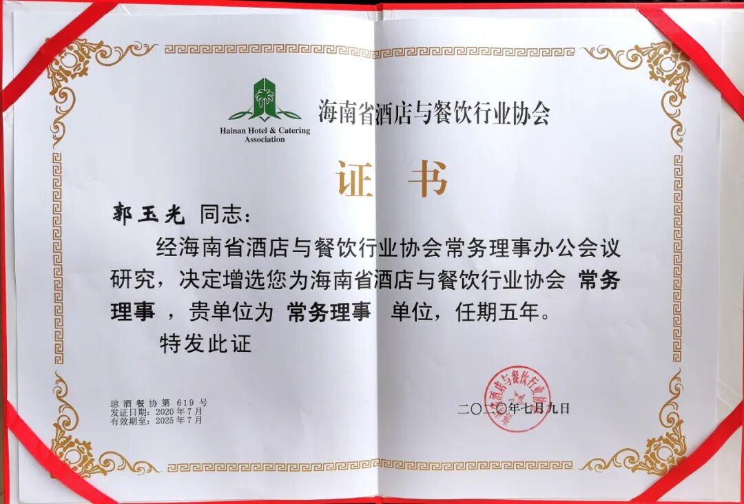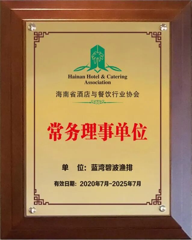 经海南省酒店与餐饮行业协会研究决定,增选蓝湾碧波渔排为第四届理事会常务理事单位,增选总经理郭玉光为常务理事,同时授予牌匾及证书。