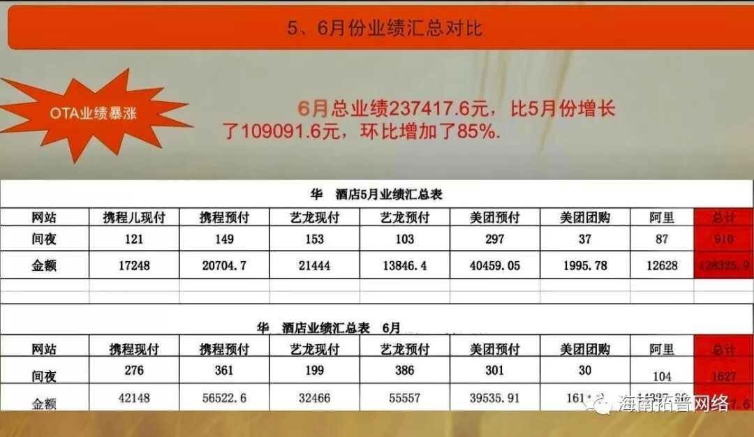 华*酒店6月总业绩237417.6元,比5月份增长了109091.6元,环比增长了85%