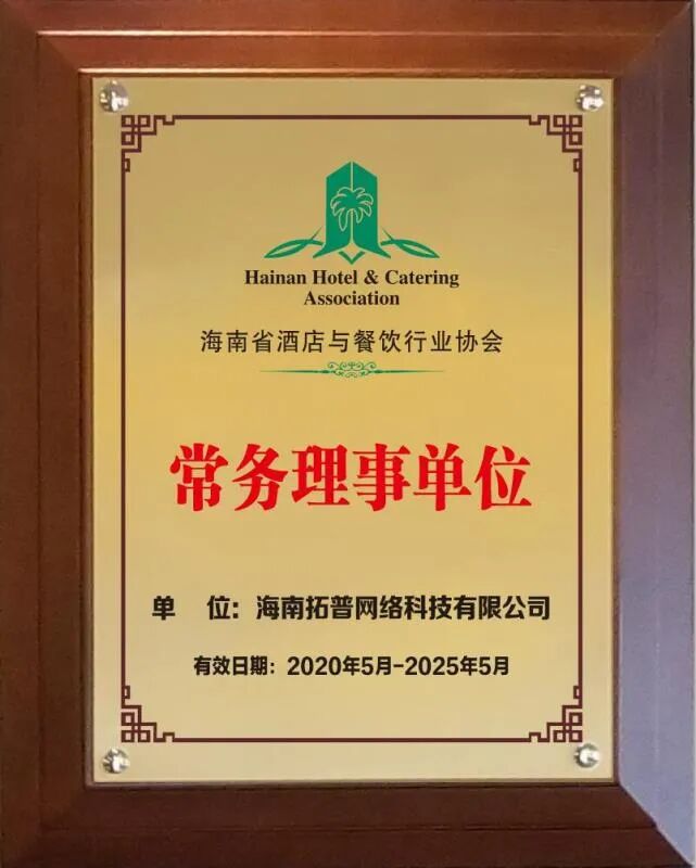 热烈祝贺海南拓普网络科技有限公司成为海南省酒店与餐饮行业协会常务理事单位