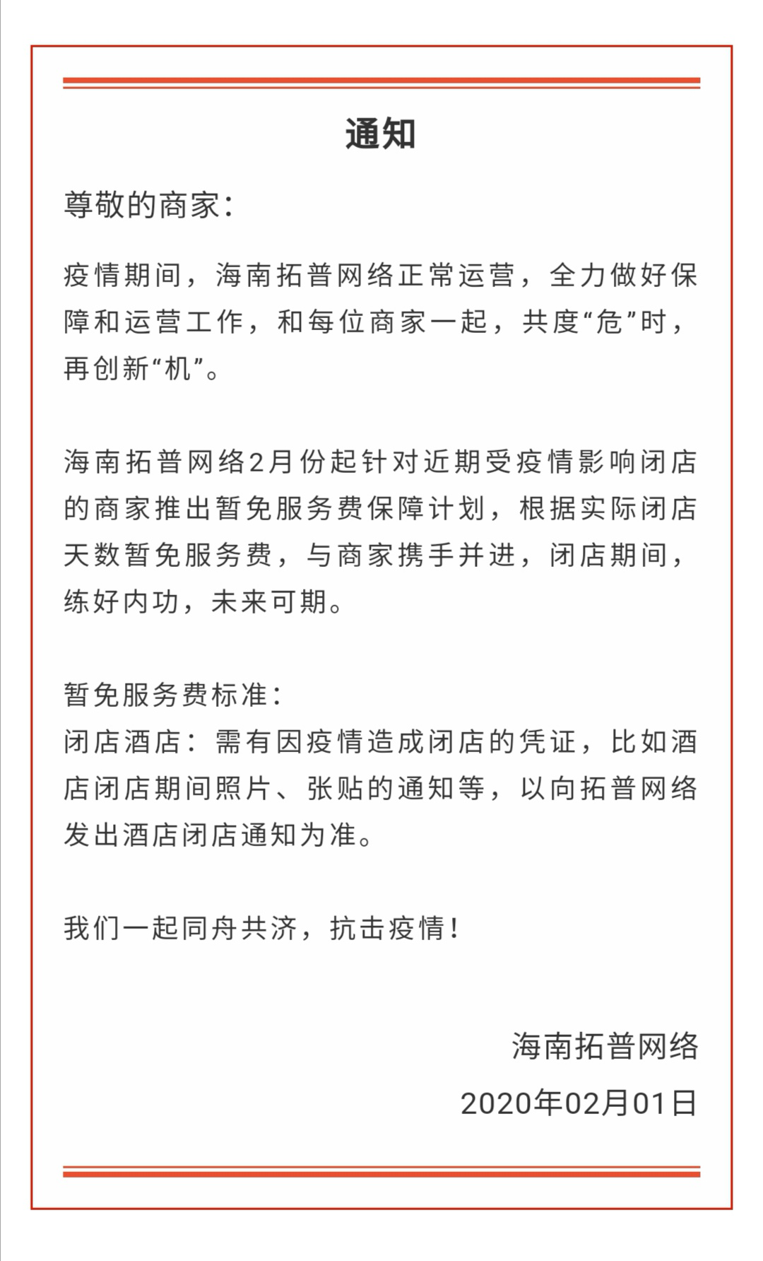 1、面对疫情对旅游、住宿业的冲击,拓普网络1月31日恢复工作状态,为合作商家服务不中断,服务费用全免。