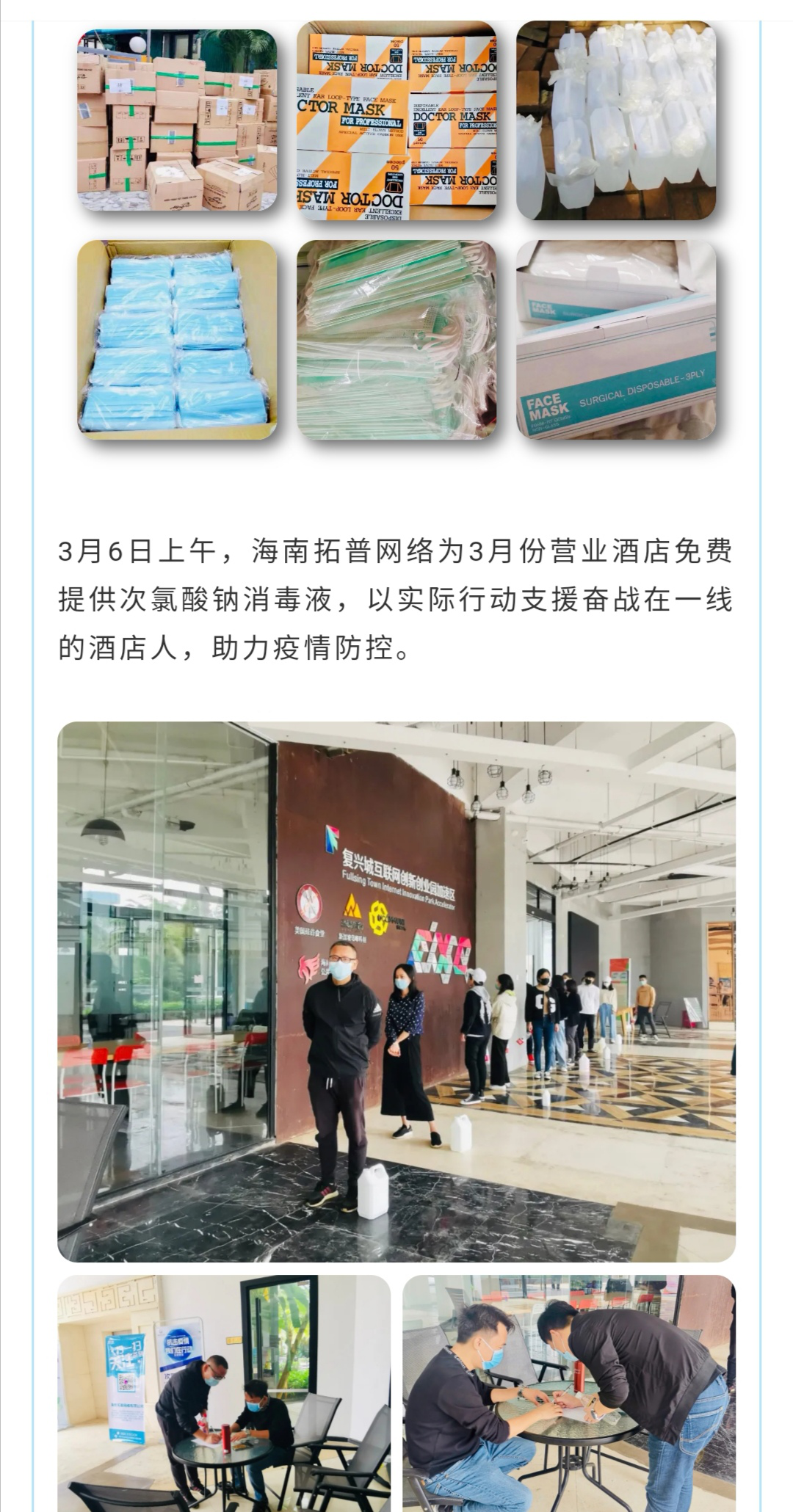 3、疫情期间,拓普网络帮助企业寻找口罩厂商,为酒店商家捐赠口罩、消毒液、酒精等消毒物资,提供专业免费空气净化与室内消毒。