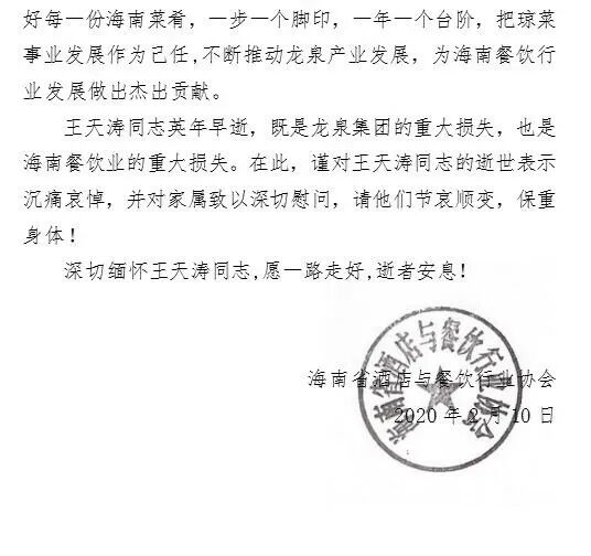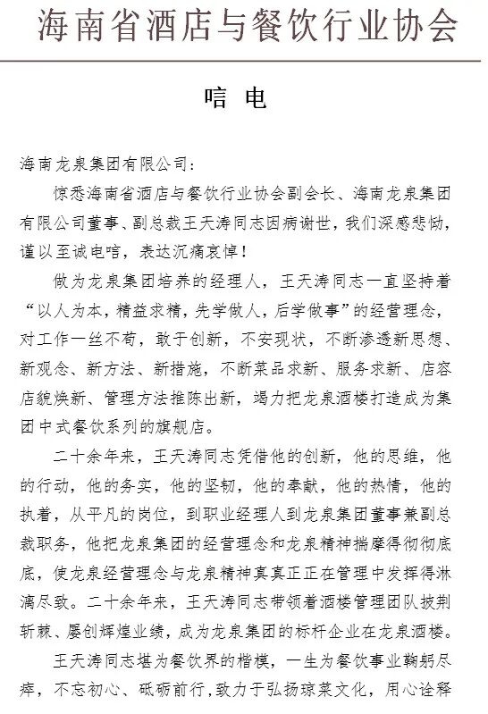 王天涛同志于今年2月9日在海口不幸因病逝世,听闻噩耗,省酒餐协于2月10日向龙泉集团发出唁电并向王天涛亲属送上慰问金,表达哀悼和追思。