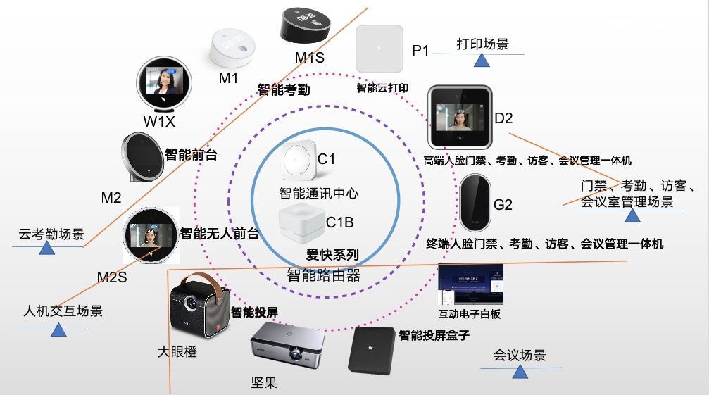 钉钉不仅支持办公的全面在在线化,同时透过钉钉这颗大脑,连接控制智能路由、智能考勤、无线投屏、无线打印等设备,真正实现智能一体化办公体系。