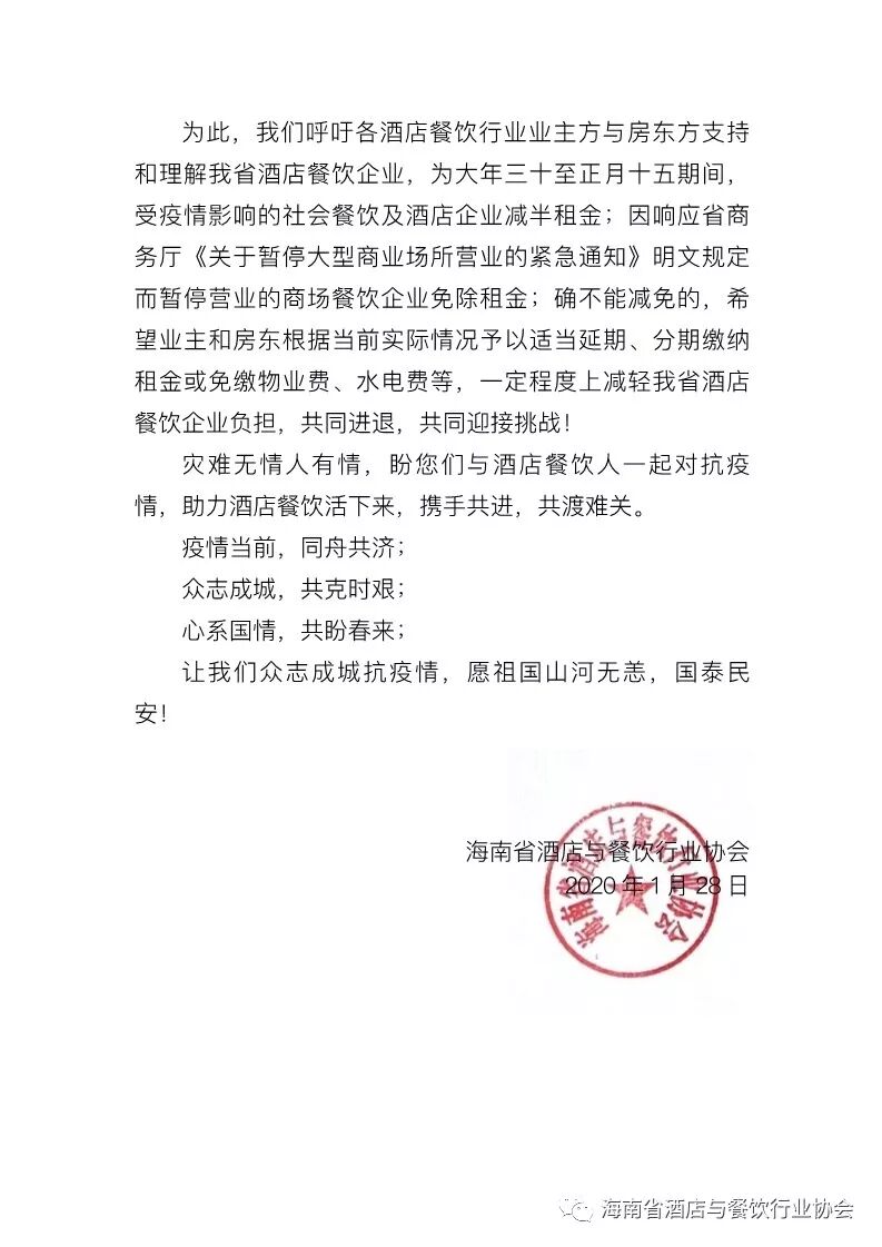关于海南启动突发公共卫生 I 级响应机制期间为我省酒店餐饮行业企业减免租金的倡议书