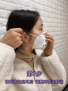 正确的戴法可以避免气体从鼻梁两侧出入,从而发挥口罩的过滤及换气功能,保护自己保护他人。第一步,洗手后,面向口罩无鼻夹的一面,两手各拉住一边耳带,使鼻夹位于口罩上方。