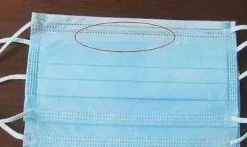 口罩分正反面、上下面,正面颜色较深,反面颜色较浅,红色圈出的地方是上面,内有鼻夹金属条。