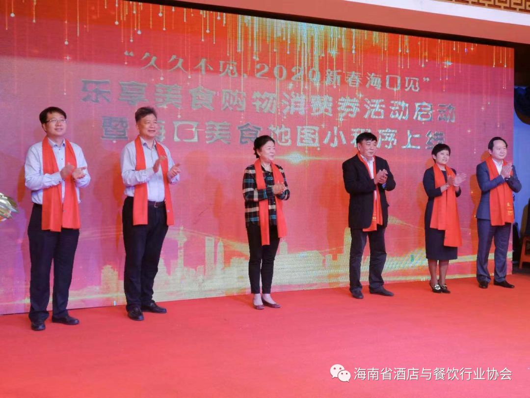 1月14日,由海南省商务厅、海南省总工会、海口市人民政府指导,海口市商务局主办,海南省酒店与餐饮行业协会、海直播传媒(海南)有限公司承办,海南省酒店与餐饮行业工会联合会、海口市餐饮烹饪行业协会、海南省龙泉集团有限公司联办的“久久不见,2020新春海口见”乐享美食购物消费券活动正式启动暨“海口市美食地图”小程序正式上线。省人大常委会原副主任、省总工会原主席符兴,省政协原副主席赵莉莎,省政府原副省长辛业江,省政协原秘书长邱国虎,省人大常委会原秘书长陈国舜,省地税局原党组书记王永存,“不忘初心,牢记使命”省委巡视指导组组长、省国资委原巡视员梁学伟,省政协经济委原主任陈菁,省市场监督管理局副局长李治平、餐饮服务监管处处长宁春杰,省统计局处长曾德立,海口市商务局党组书记董孟清,省商务厅服贸处调研员吕志辉,省人社厅就业促进处调研员孙进波,海南广播电影电视传媒集团有限公司副总经理王非,海口市商务局调研员陆宾林,海口市财贸工会主席李东安、副主席钟光辉,中国饭店协会副会长、省酒餐协会长、海南龙泉集团有限公司董事长符史钦,中国饭店协会副监事长、省酒餐协执行会长陈恒,省酒餐协理事长、海南皇马假日酒店集团有限公司董事长黄俊忠,省酒餐协监事长、海南荷泰投资发展有限公司董事长李朝清,海直播传媒(海南)有限公司总裁丁黎平,海口市餐饮烹饪行业协会会长林壮森,以及省内行业重点酒店餐饮企业、知名企业、供应商及相关企业、院校、媒体负责人约300人出席。