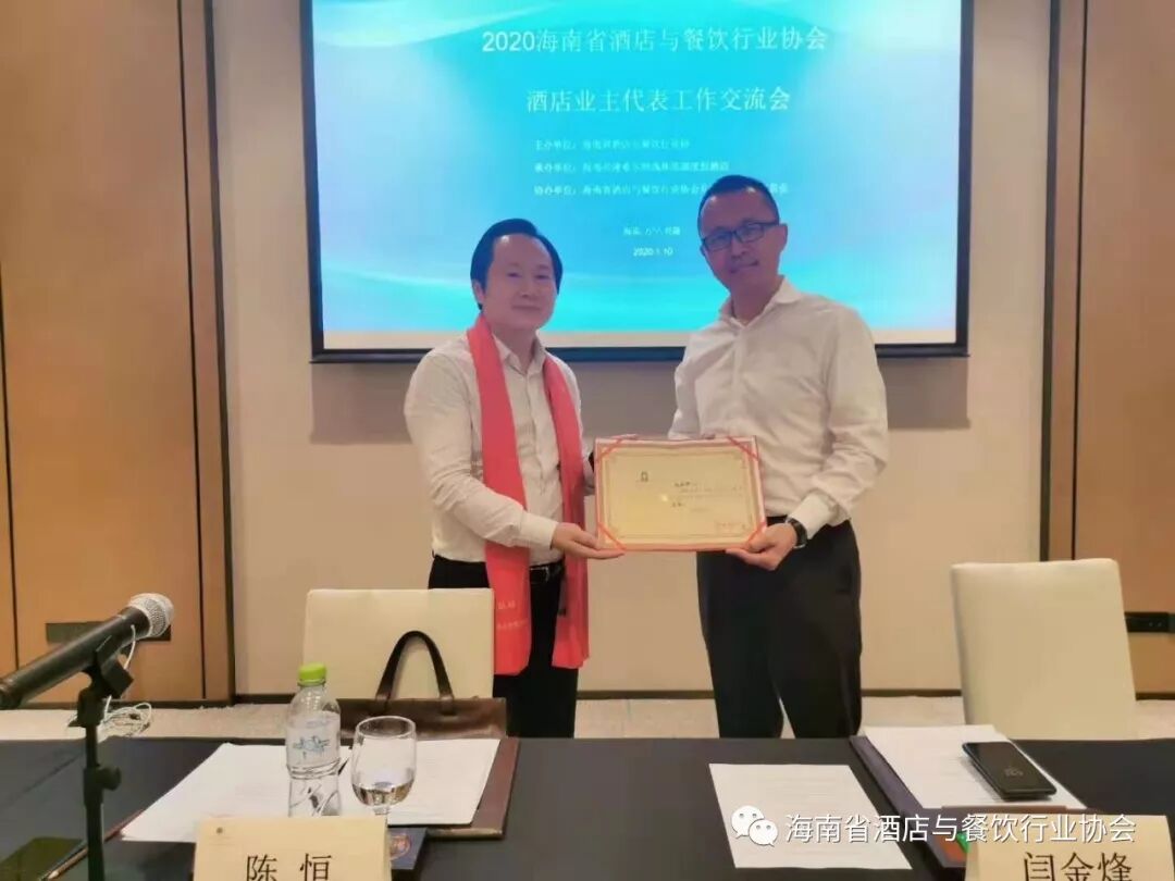 会上,在与会代表的见证下,由陈恒执行会长为海南兴隆希尔顿逸林滨湖度假酒店闫金烽业主代表颁发主任证书。