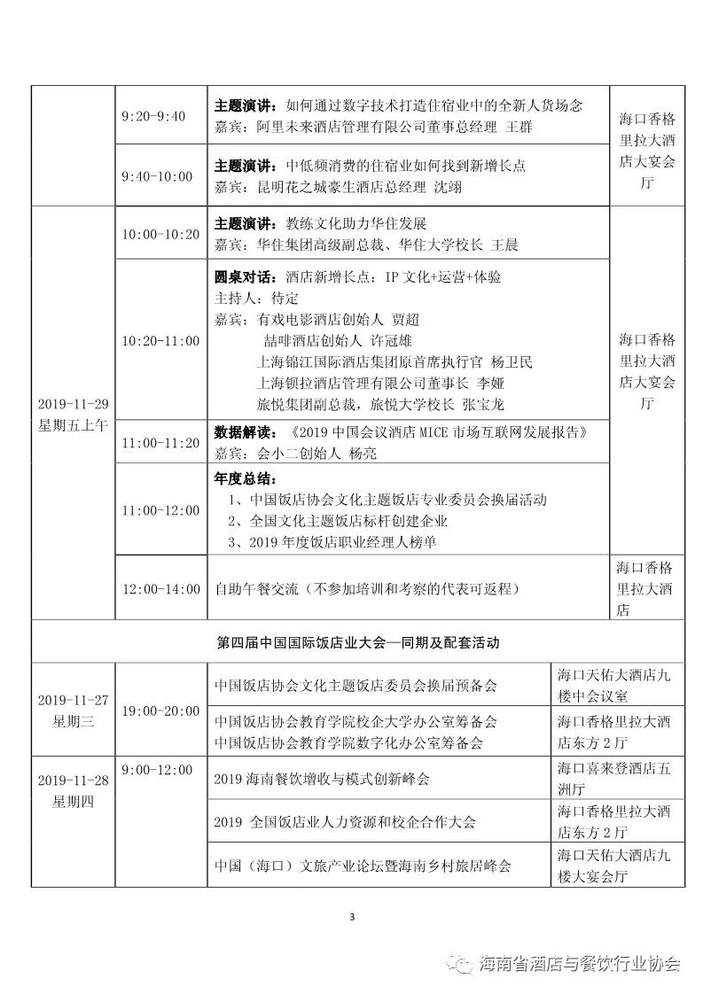为顺应文化和旅游消费提质转型升级新趋势,以新发展理念引领饭店行业高质量发展,倡导绿色消费,营造饭店业安全消费环境,同时助力海南省自由贸易试验区(港)和国际旅游消费中心建设,第四届中国国际饭店业大会将于11月27日-30日在海口举行。大会由中国饭店协会与海口市人民政府主办,由中国饭店协会住宿业事业部、海口市商务局、海南省酒店与餐饮行业协会承办。大会以“致敬新中国七十华诞,引领住宿消费新增长”为主题,设置了国际趋势展望、年度数据发布、细分市场研讨、国际旅游岛合作、海南特色文化体验考察五方面内容,深入探讨、把握时代大势,坚定发展信心,挖掘文旅与商业消费潜力,全面展示全国饭店业高质量高标准发展优秀经验与成果,探讨新时代绿色引领、文化创新、人才培育、科技赋能、区域协调的发展新路径、新供给和新动力。