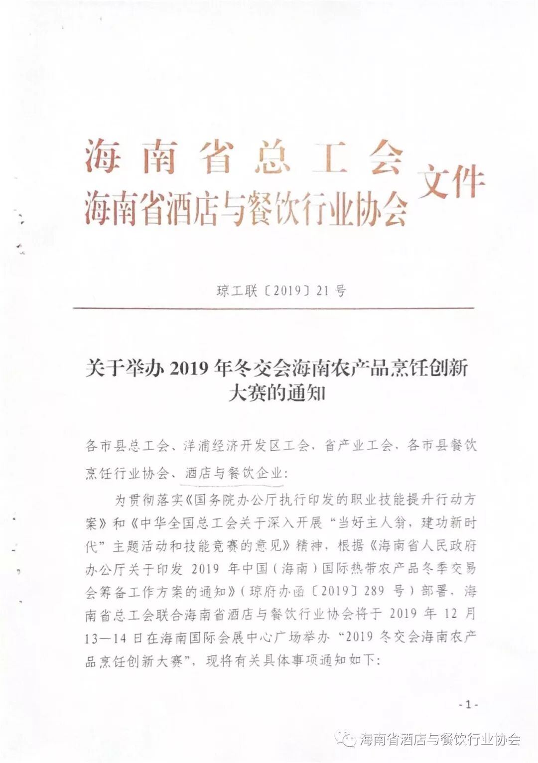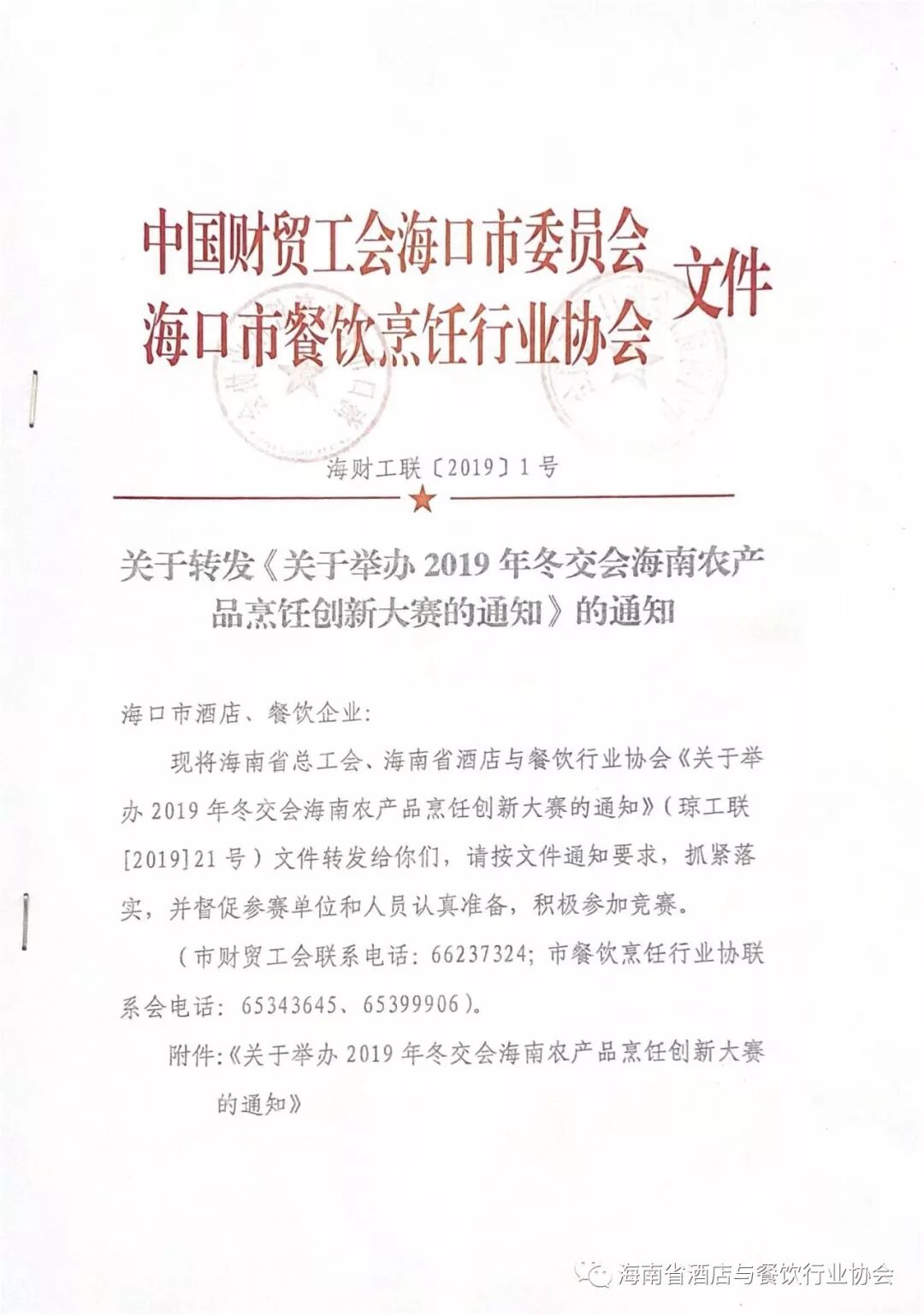 关于转发《关于举办2019年冬交会海南农产品烹饪创新大赛的通知》的通知