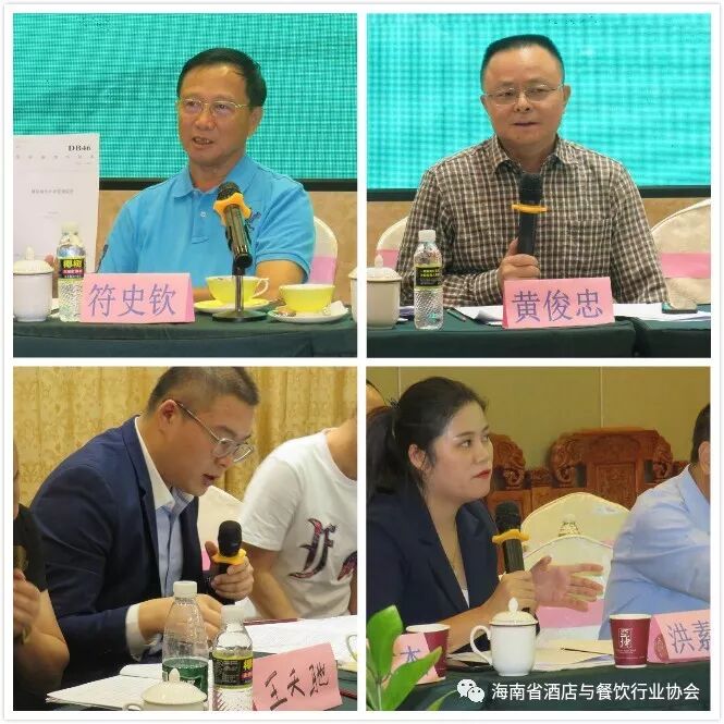 会议第一阶段,与会代表对我会受省商务厅委托起草的《餐饮企业绿色后厨管理规范》、《餐饮绿色外卖管理规范》两个餐饮业绿色标准草案进行了征求意会座谈,由主笔人海南师范大学旅游学院教授唐少霞、方园认证中心主任郑石华分别对草案进行讲解,并广泛征求与会代表意见与建议。海南龙泉集团有限公司董事长符史钦、省酒餐协执行会长陈恒,海南皇马假日集团有限公司董事长黄俊忠,海南十八碗餐饮文化管理有限公司区域总经理洪素娜,海口积橙餐饮管理有限公司总经理游秭筠,美团点评集团海南区域政府事务负责人叶焰锋,海口喜来登酒店卫生经理潘小庆等都纷纷对草案都发表了自己的意见及看法。