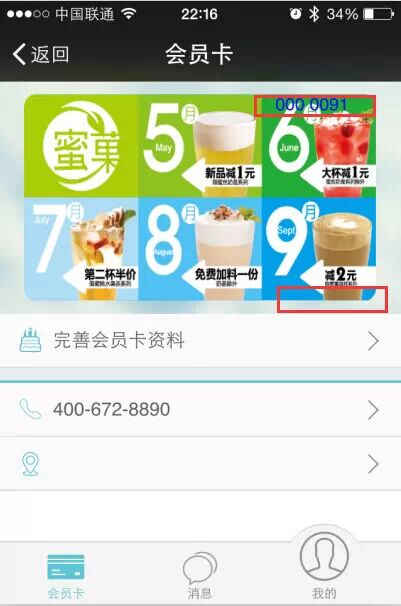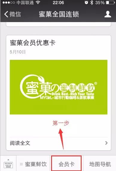 首先步:进入蜜菓微信公众号,点击进入会员卡页面