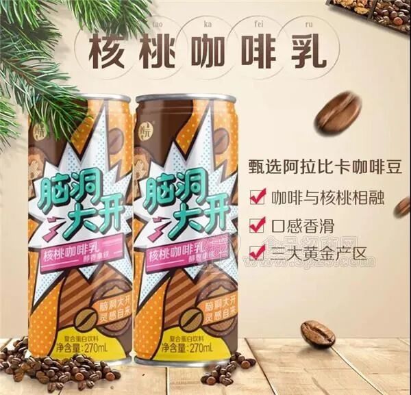 养元在核桃产业基础上,打造了全新的核桃系列产品核桃咖啡乳,这款核桃咖啡名为“脑洞大开”,是一款复合蛋白饮料。