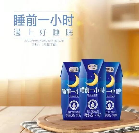 2019年11月份,君乐宝助眠牛奶“睡前一小时”上市。该产品宣称蛋白含量高达3.4g/份,0蔗糖添加,并特别添加天然安神成分γ-氨基丁酸(GABA)。