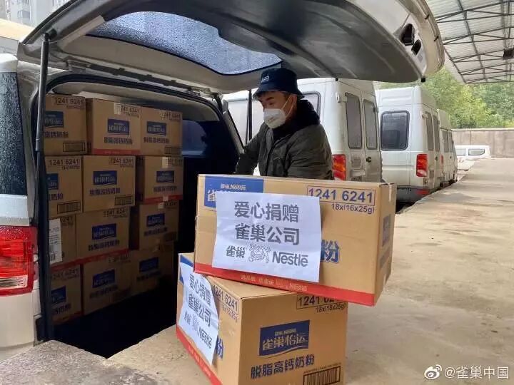 1月24日起,雀巢中国携旗下惠氏营养、徐福记、银鹭、太太乐等品牌,从全国各地调配各类营养补给品,第一时间送到抗击疫情的医务工作者手中。24日中午,雀巢武汉当地员工,把首批营养补给物资赠送给了武汉市中心医院的白衣天使们。同时,雀巢还通过中国红十字基金会捐赠产品和现金总额约4000万元。