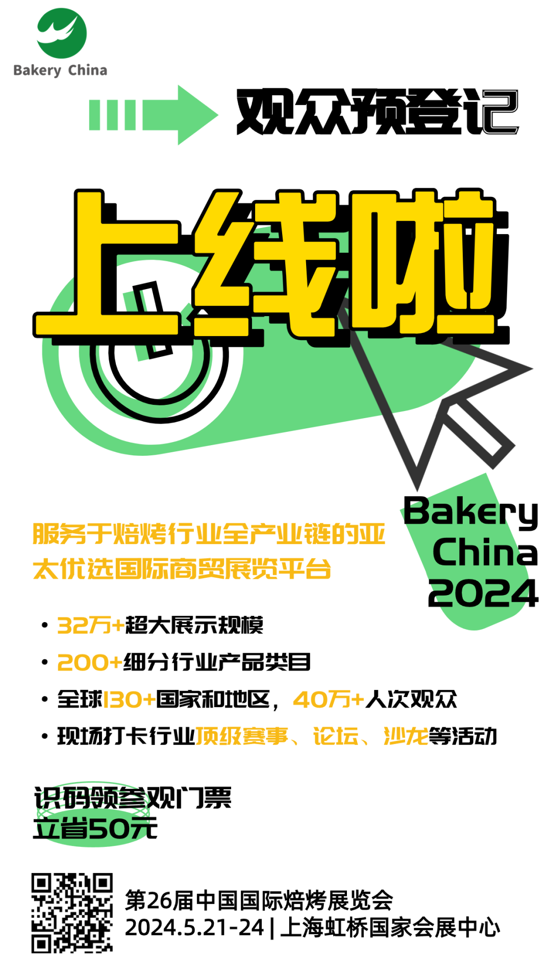 点击【阅读原文】,免费领2024第26届中国国际焙烤展(5.21-24,上海虹桥国家会展中心)参观门票,立省50元门票费!