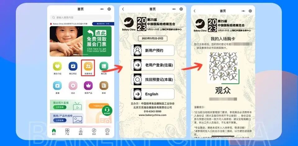 ①您可以在微信中搜索【中国国际焙烤展BakeryChina】公众号,或者【BakeryChina】小程序进入点击【我要参观】按照要求填写信息领取您的参观二维码。