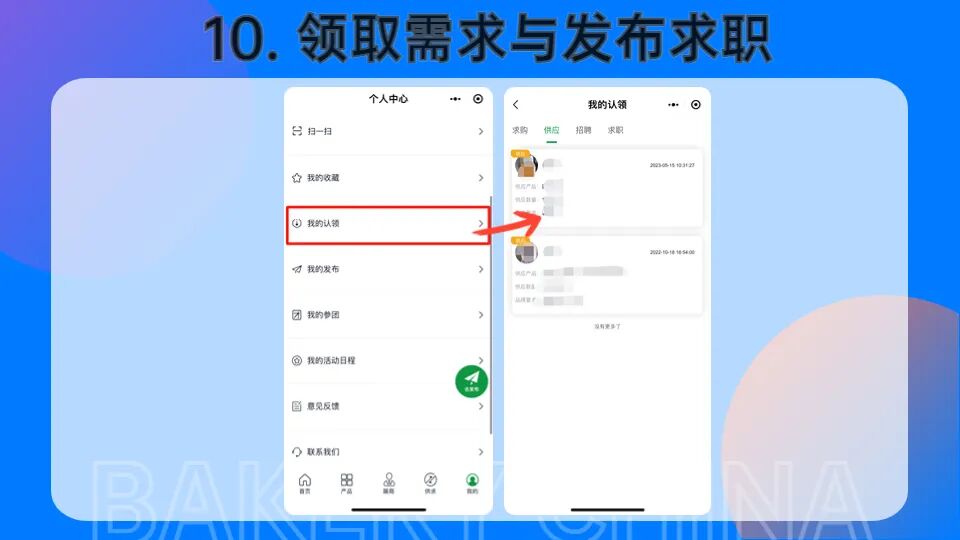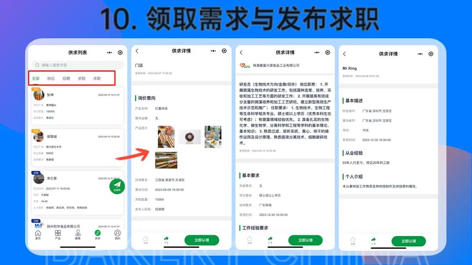 >进入焙烤商贸云平台,点击【供求】,您可以根据【供应】、【招聘】、【求购】、【求职】4大类别查看信息,点击相关题目即可查看对应的供需详情信息。如果您符合需求,即可点击【立即认领】。认领后进入【个人中心】