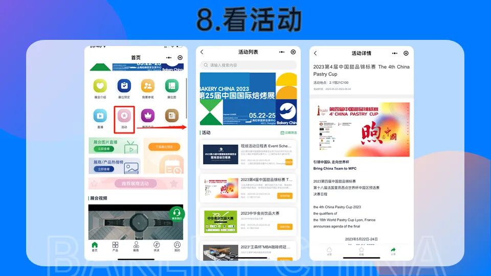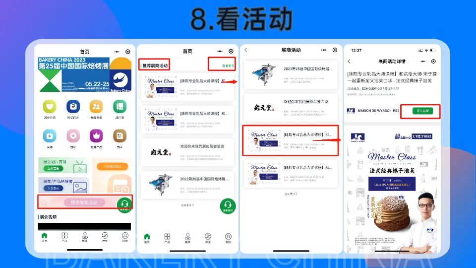 >进入焙烤商贸云平台,点击【活动】即可查看本次展期现场活动详情。点击您关注的活动名称,即可查看活动详情。