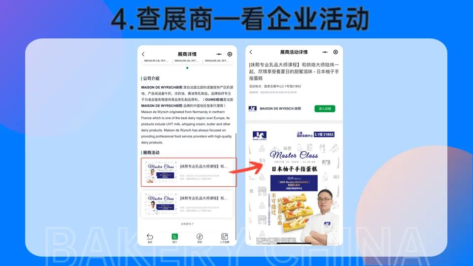 >在焙烤商贸云首页,点击【推荐展商活动】或者向下滑动页面,您可以查看本届展会期间的【推荐展商活动】列表,点击活动名称/图片,即可查看活动详情。如您对该企业感兴趣,还可点击【进入店铺】详细了解企业和产品信息。