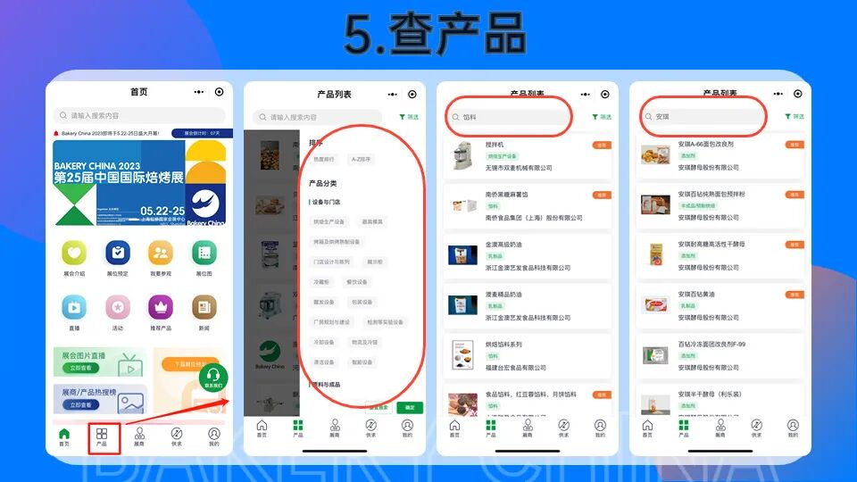 >您可以通过:产品字母排序、热度榜单、产品类别搜索产品信息,也可以在搜索框内输入产品名称、企业名称、展位号等关键字搜索对应企业信息。