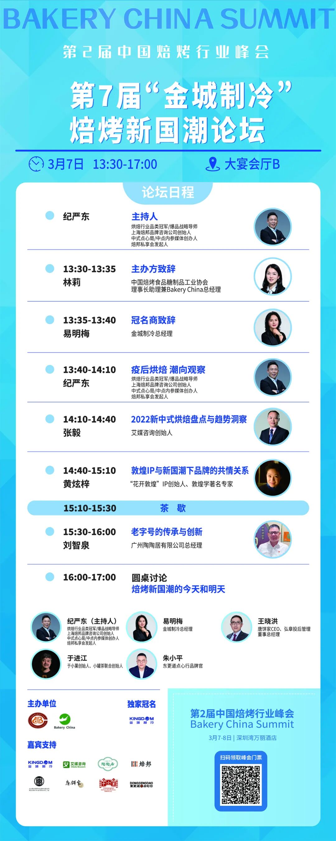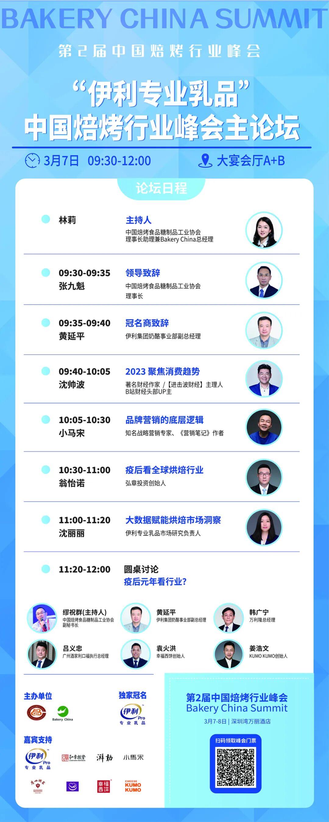 本次峰会由1场主论坛和6场次平行论坛组成,分别聚焦行业年度盘点和大趋势预测、门店经营与管理、焙烤新国潮、营销、供应链与品牌创新、焙烤健康趋势、预制烘焙等行业热门话题,邀请近60位来自烘焙、餐饮、营销、投融资等多行业的重磅嘉宾到场分享。