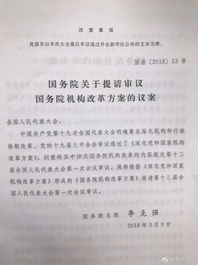 根据国务院总理李克强提请第十三届全国人民代表大会第一次会议审议的国务院机构改革方案的议案: