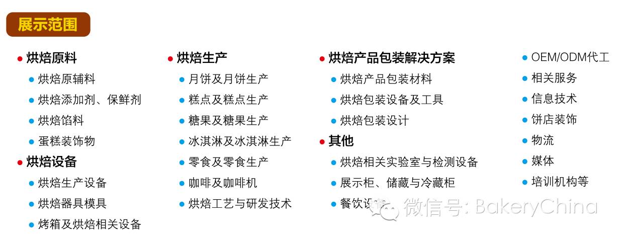 主办方: 中国焙烤食品糖制品工业协会 北京贝克瑞会展服务有限责任公司 地址:北京市海淀区高梁桥斜街59号中坤大厦612室 邮编:100044 邮箱:cnbakery@163.com 网址:www.bakerychina.com 微信:中国国际焙烤展BakeryChina |