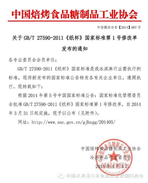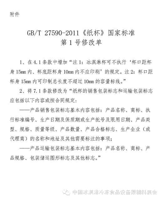 关于GB/T 27590-2011《纸杯》国家标准第1号修改单发布的通知