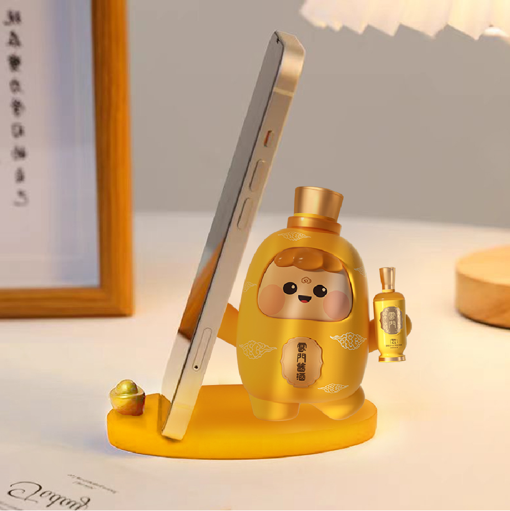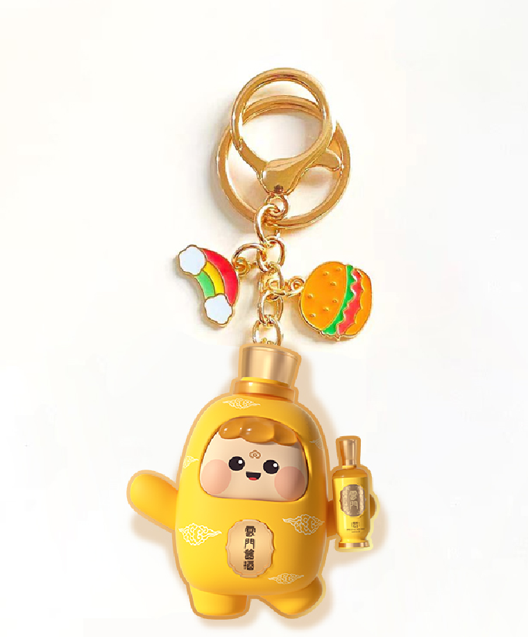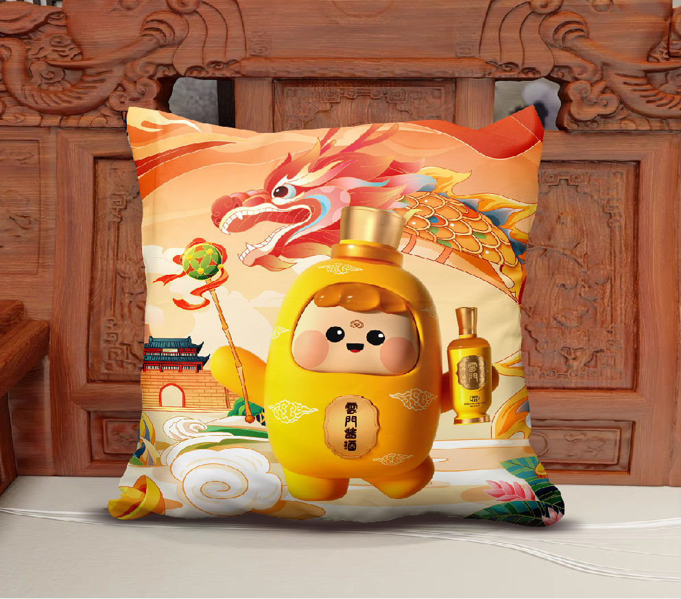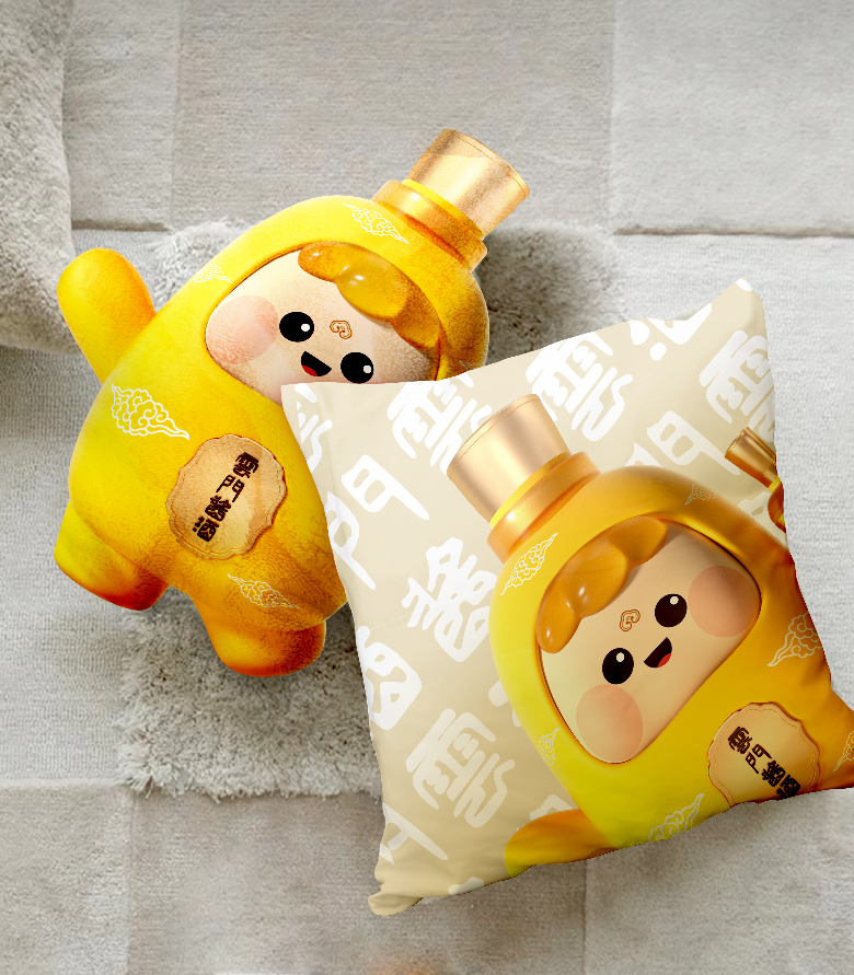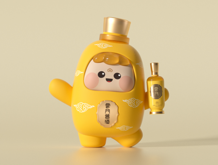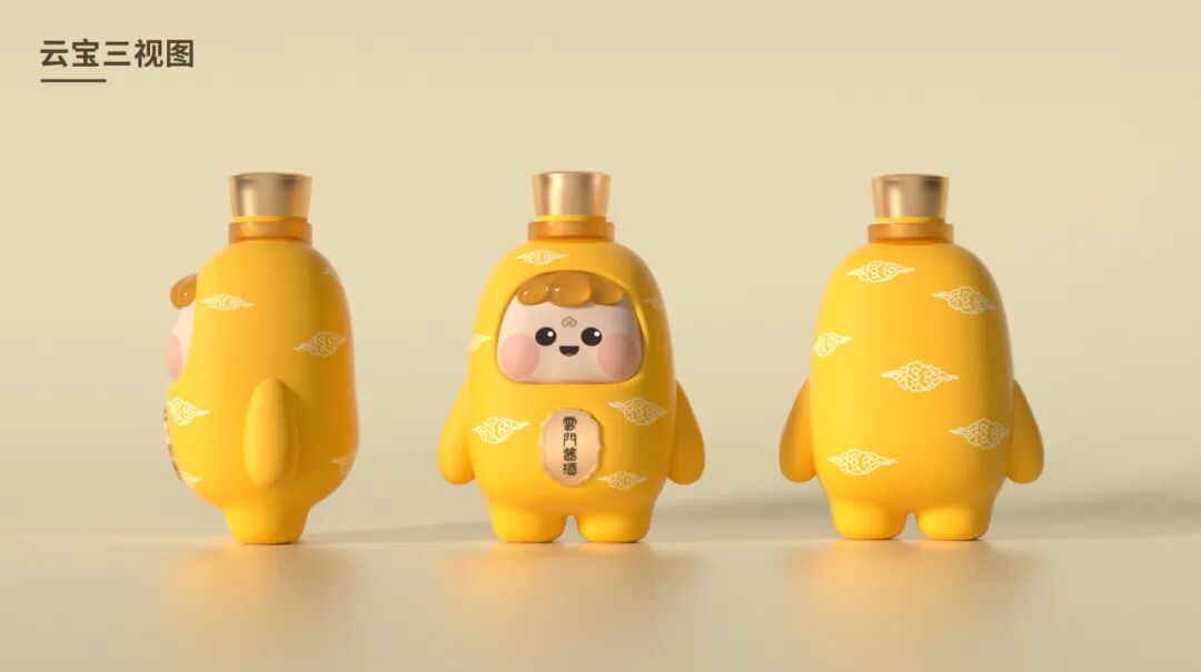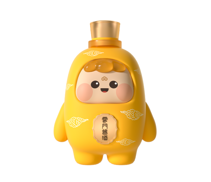 酒的瓶身组成了身体,以经典的黄色作为主色调,以祥云图案作为衣服的主要元素,酒瓶的金色盖子被设计为“云宝”的礼帽,而极具辨识度的琉璃被设计为头部以及发型,酒瓶所有的经典元素得以保留。