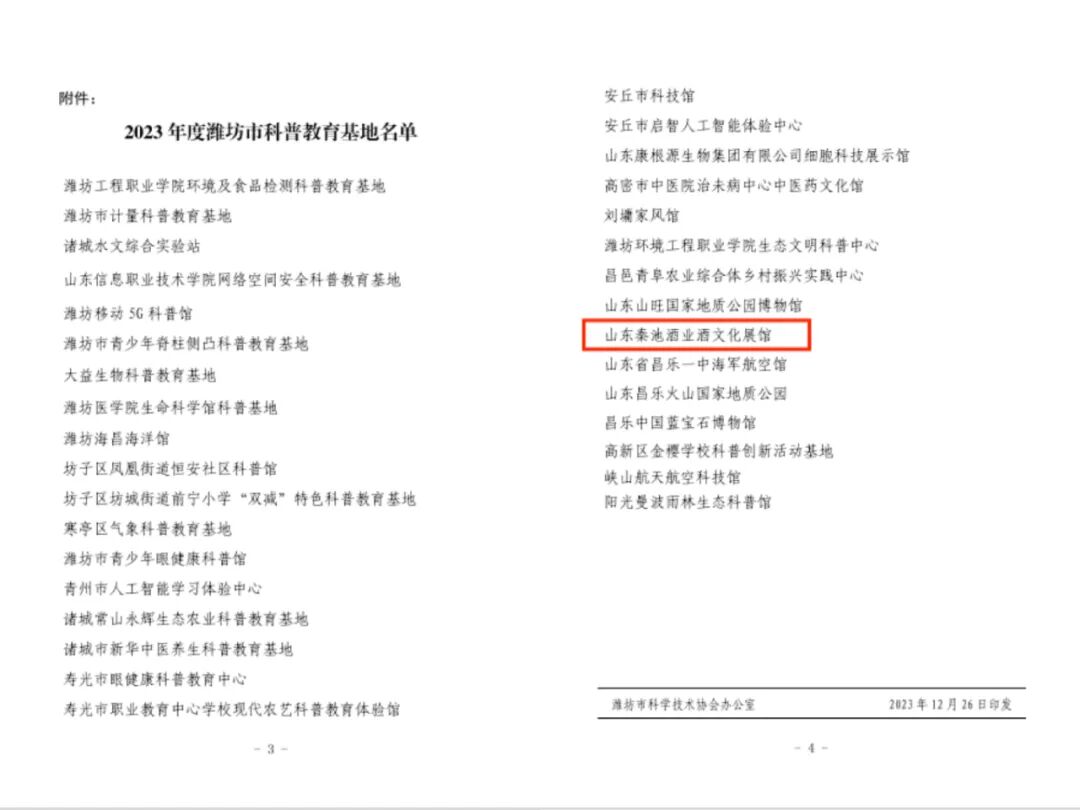 日前,为深入贯彻落实党的二十大精神和《全民科学素质行动规划纲要(2021-2035)》,大力推进全市科普基础设施建设,提升基层科普服务能力,依据《潍坊市科普教育基地认定管理办法》,通过基层申报推荐,潍坊市科协、潍坊市教育局、潍坊市科技局联合审查评定、公示等程序,共有 33 个单位被命名为潍坊市科普教育基地(2024-2026),秦池酒文化展馆榜上有名。