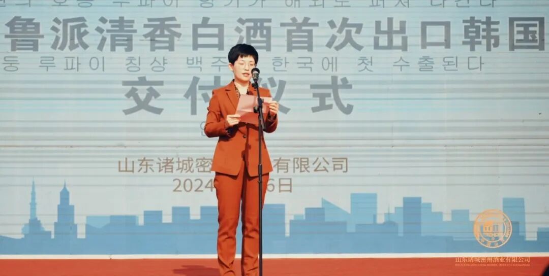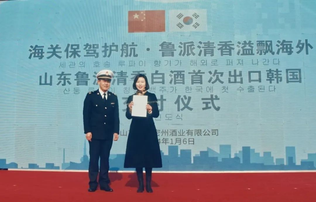 2024年1月6日,密州酒业隆重举行密州酒业出口韩国白酒交付仪式。首批出口韩国的“鲁派清香”白酒,顺利完成白酒出口出入境检验检疫,通过海关各类出口检验及审批报关手续,从青岛港装箱上船交付韩国。这是山东省清香型白酒的首次出口,标志着山东省白酒产业创新驱动发展的转变,更是“诸城模式”外向型发展的新篇章。