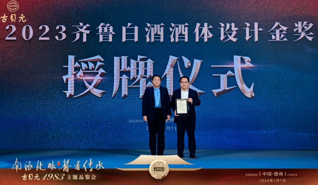 会上,古贝春集团党委副书记、总经理张洪昌(右一)代表企业接受了山东省白酒协会副会长兼秘书长蒋彬(左一)为古贝春集团颁发的“2023齐鲁白酒酒体设计金奖”证书。