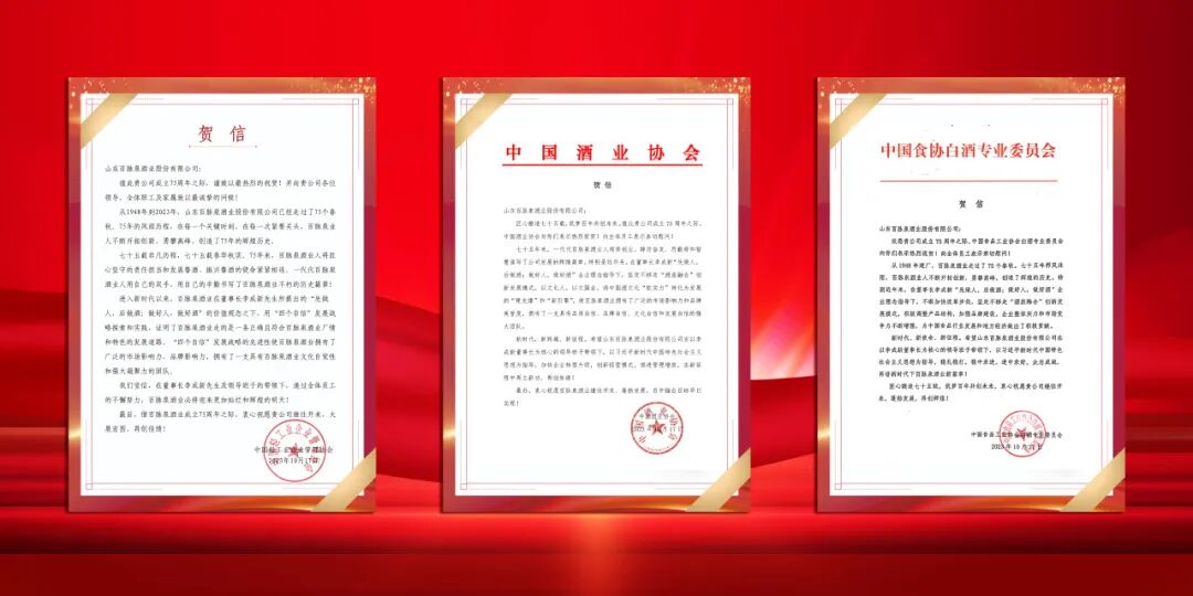 75载风雨兼程,百脉泉酒业人用热血和青春筑就新的辉煌;传承使命,赓续奋进,百脉泉酒业必将继续秉承传统,继往开来。会上,中国酒业协会、中国食协白酒专业委员会、中国轻工业企业管理协会为百脉泉酒业成立75周年发来的贺信。山东省演讲学会诵读专委会副主任、章丘区朗诵家协会副主席张丽萍上台宣读由中国酒业协会发来的贺信。