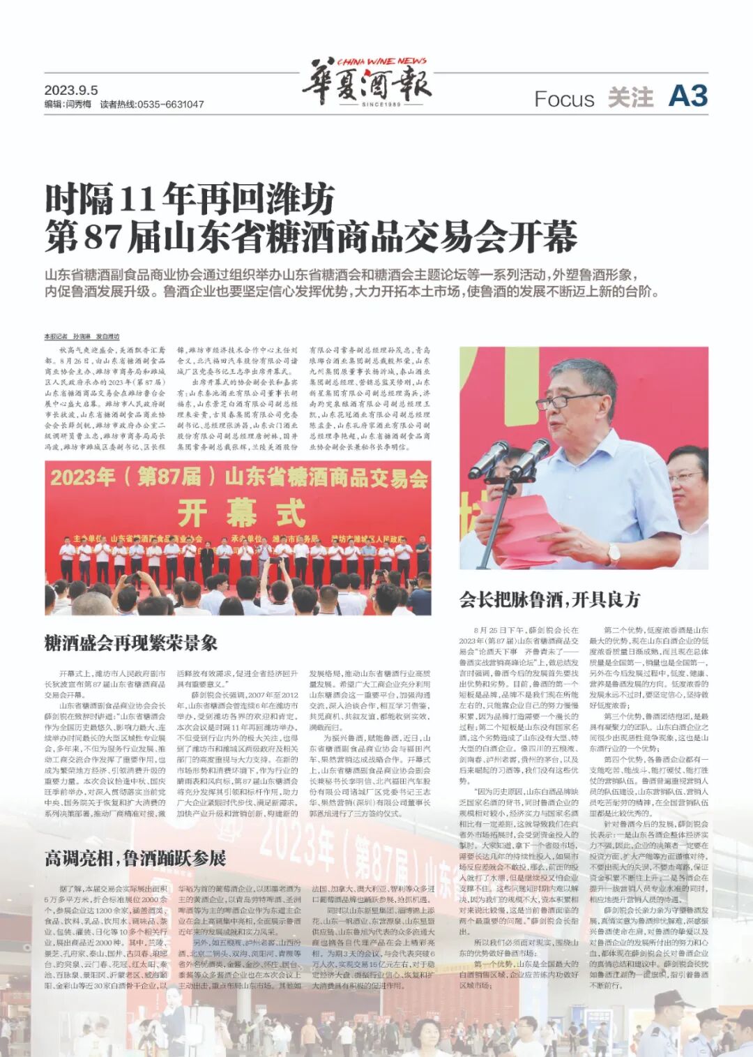 8月25至27日,2023年(第87届)山东省糖酒商品交易会在潍坊鲁台会展中心举办。本届会议由山东省糖酒副食品商业协会主办,潍坊市商务局和潍城区政府承办,潍坊市食品协会、山东景芝白酒有限公司、山东云门酒业有限公司和山东秦池酒业有限公司协办。我省大部分酒类、食品行业的厂商以及其他 20 多个省市的工商企业参加了会议。会议得到了潍坊市人民政府和潍城区人民政府的大力支持和广大与会企业的密切配合,开的圆满成功。