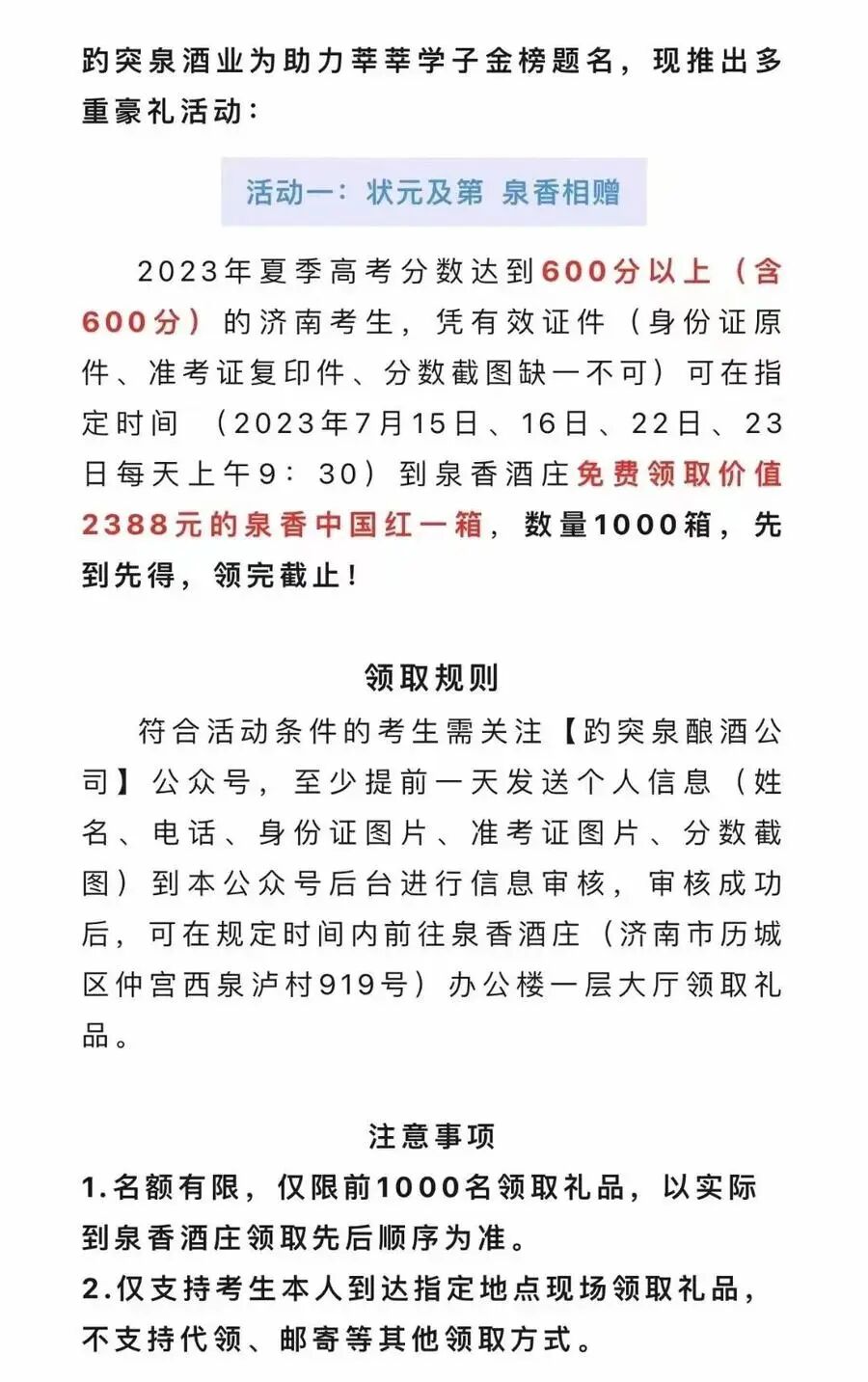 趵突泉酒业“金榜题名 泉香庆功”活动仍在火热进行中,符合活动条件的考生可按下图所示积极参与,我们期待在泉香酒庄与您相见!