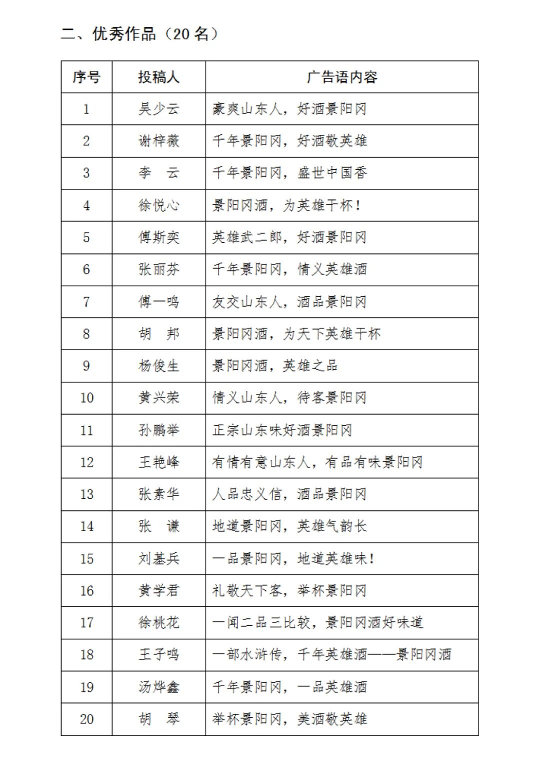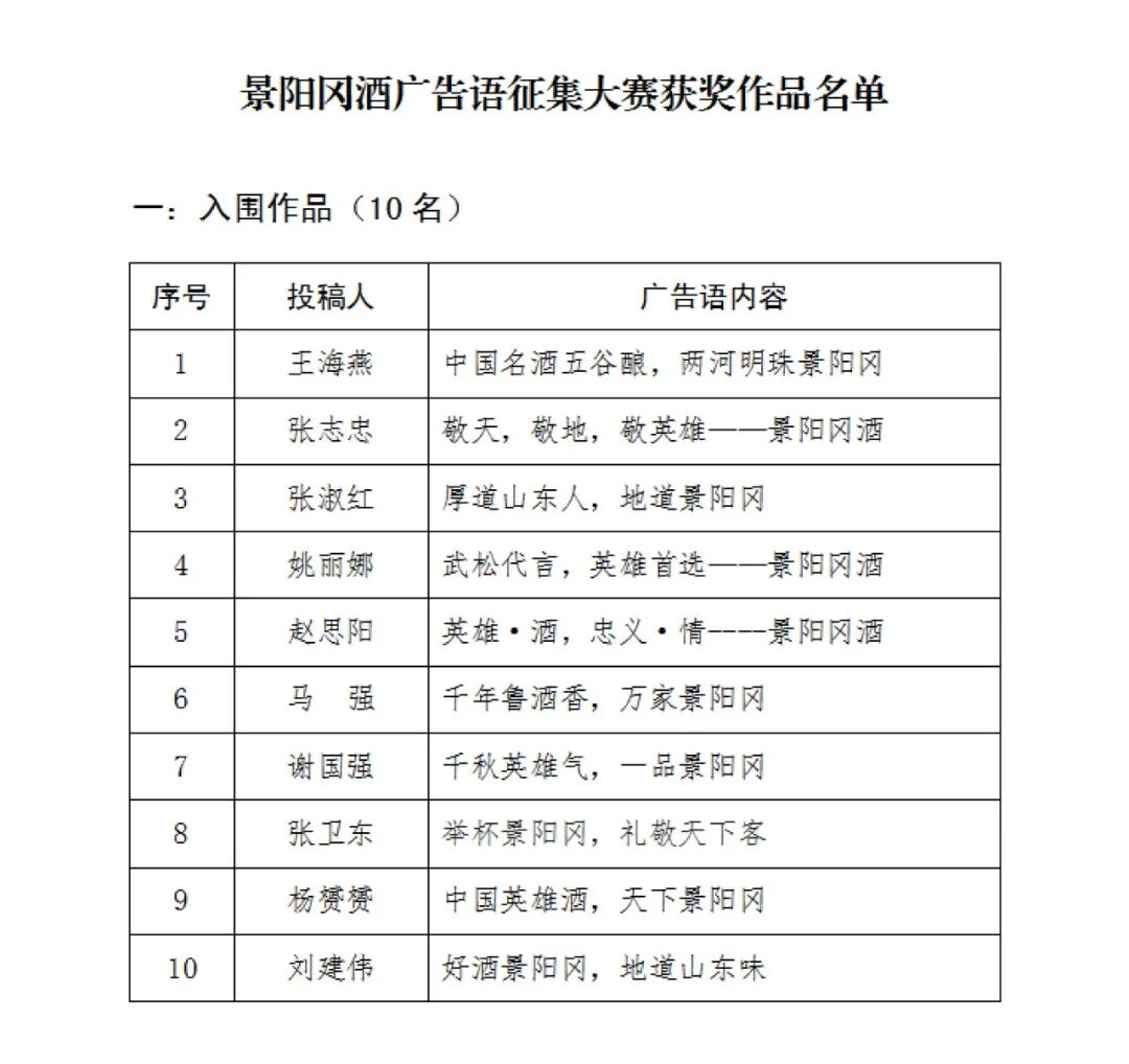 景阳冈酒广告语征集大赛获奖作品评选结果