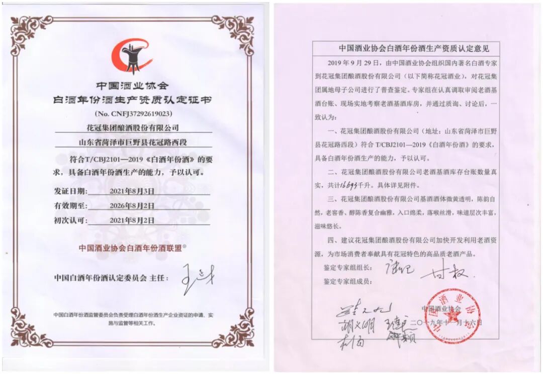 2019年11月份,中国酒业协会年份酒认证委员利用气相色谱分析和三维荧光光谱分析等先进的年份鉴别技术,在花冠集团现场认证并封存了1.67万吨5年以上的年份酒基酒,后又陆续认证了花冠鲁雅香年份储藏17年、12年和9年等产品,使花冠集团成为经中国酒业协会认证的可以在市场流通产品上标注真实年份的白酒生产企业。2021年12月,中国酒业协会对年份酒产品认证进行了升级,联合第三方监管机构--方圆标志认证集团开展年份酒认证工作,花冠集团紧跟步伐,于2022年9月19日正式启动了年份酒产品双重认证,中国酒业协会与方圆标志认证集团联合组建的认证专家团队对花冠集团的生产资质、生产能力、检测能力、技术人员、生产管理以及年份酒基酒存储量和年份酒产品等进行详细的现场查验与论证后,一致认为花冠集团具备年份洒产品认证的要求和条件。