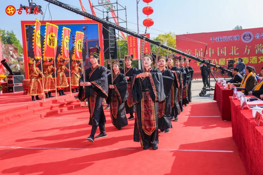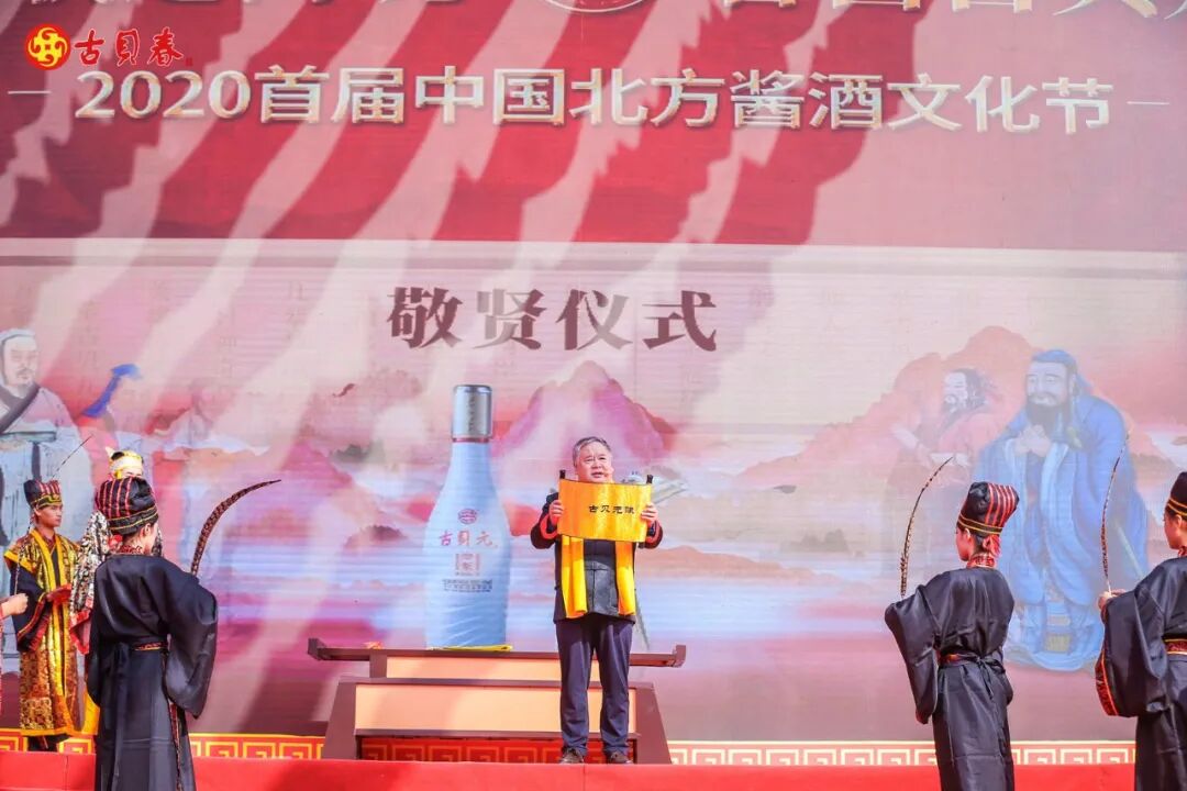 讲话结束后,主持人邀请中国军事科学院原副院长、全国政协原常委葛东升中将,全国人大常委会委员、华侨委员会副主任委员、致公党中央副主席曹鸿鸣,公安部警卫局副局长翟运行少将,著名相声表演艺术家、古贝春形象代言人赵炎先生,中国食品工业战略发展委员会委员、山东省政协原副主席陈光,山东省糖酒副食品商业协会会长薛剑锐,德州市政协副主席王春利,武城县委书记张磊,古贝春集团有限公司董事长、总经理周晓峰共同上台举行“首届中国北方酱酒文化节启动仪式”。随着各位领导、嘉宾手中的启动杆缓缓推进,10条彩带从舞台上空飞向观众,搭建起“彩虹天桥”,预示着古贝元即将飞向蓝天、振翅翱翔!铭记历史、感恩先贤,继承传统、不忘初心。为表达古贝春人对酿酒文化的尊重和坚守品质的决心,古贝春举行了隆重的敬贤仪式。在身着传统服饰的司礼官主持下,舞台大屏幕缓缓打开,酒仙山出现雾气蒸腾、仙光缭绕的特效,大屏幕依次出现孔子、老子、子游、孙伏枷、杜康、仪狄等先贤人物和酿酒祖师,在摆好的香案上,由礼仪依次献上锦帛、美酒、文赋,最后由著名相声表演艺术家、古贝春形象代言人赵炎先生诵读《古贝元赋》。赵炎先生的朗诵字正腔圆、深沉凝重、铿锵有力、掷地有声,表达了对先贤的无限追思,许下了不辱使命的庄严承诺。会场响起经久不息的掌声。