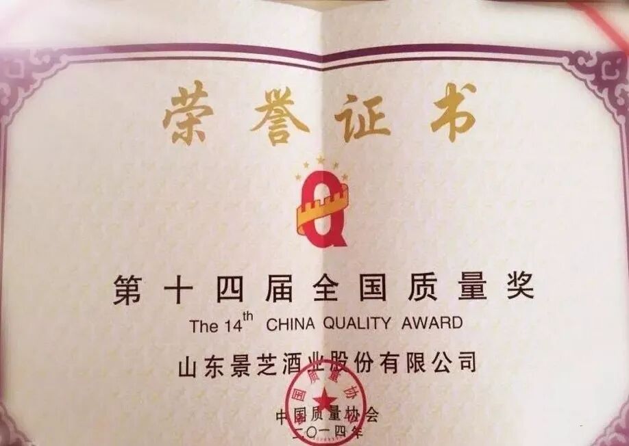 最非凡的成功,不是超越别人,而是战胜自己;最可贵的坚持,不是久经磨难,而是永葆初心。景酒人不断奋进,获得了辉煌的成就,先后获得山东省省长质量奖、全国质量奖、国家地理标志保护产品、中国名特白酒国家标准样品、中国轻工业科技进步一等奖、首届中国白酒最佳性价比产品评选第一名、全国酒类产品质量安全诚信推荐品牌、中国历史文化名酒、中国白酒历史标志性产品等荣誉。